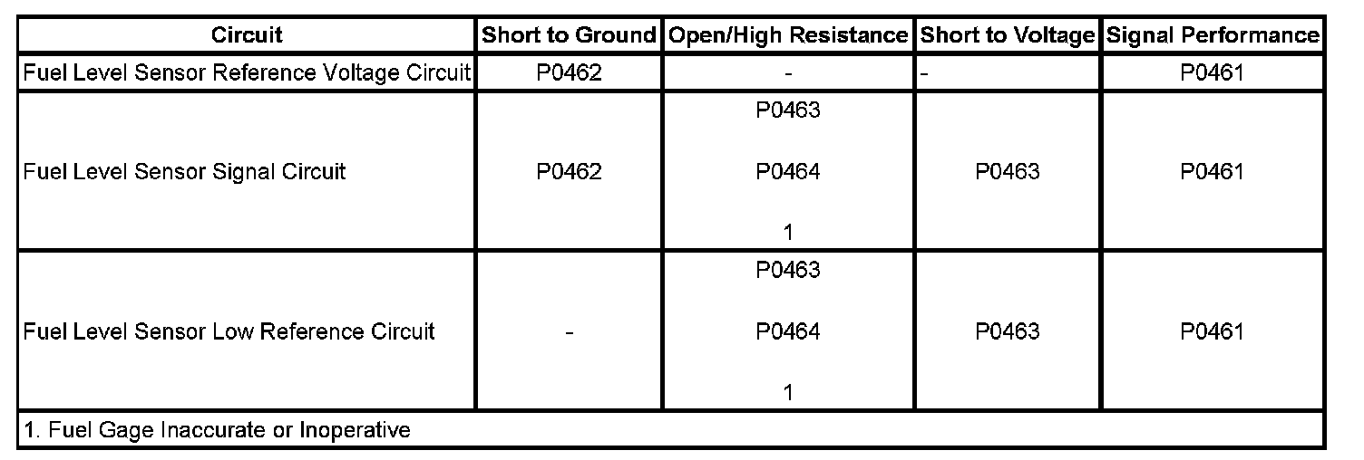 The fuel level sensor changes resistance in response to the fuel level. The engine control module (ECM) monitors the signal circuit of the fuel level sensor in order to determine the fuel level. When the fuel tank is full, the sensor resistance is low and the ECM senses a low signal voltage. When the fuel tank is empty, the sensor resistance is high and the ECM senses a high signal voltage. The ECM uses the signal circuit of the fuel level sensor in order to calculate the percentage of remaining fuel in the tank. The ECM sends the fuel level percentage via GMLAN serial data circuit to the instrument cluster in order to control the fuel gage. The fuel information is also used for misfire, evaporative emission (EVAP), and other on-board diagnostics.