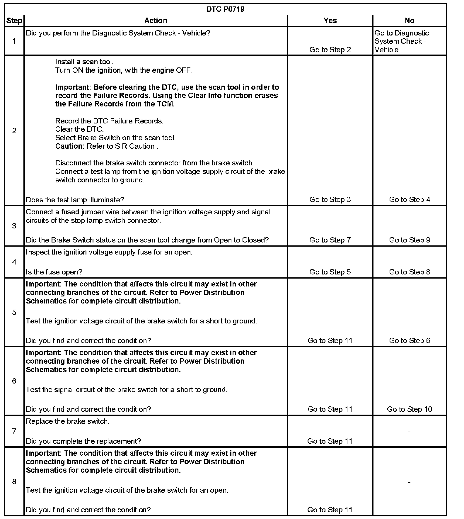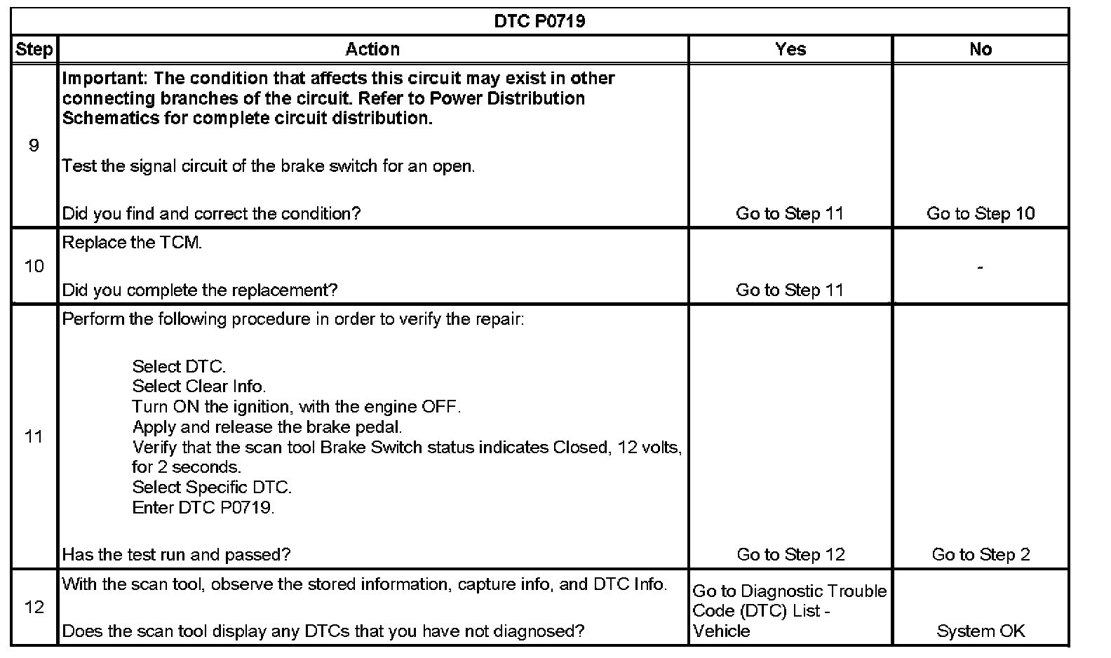 When the TCM detects an open stop lamp switch circuit, 0-volts, during a calibrated number of decelerations, then DTC P0719 sets. DTC P0719 is a type C DTC.