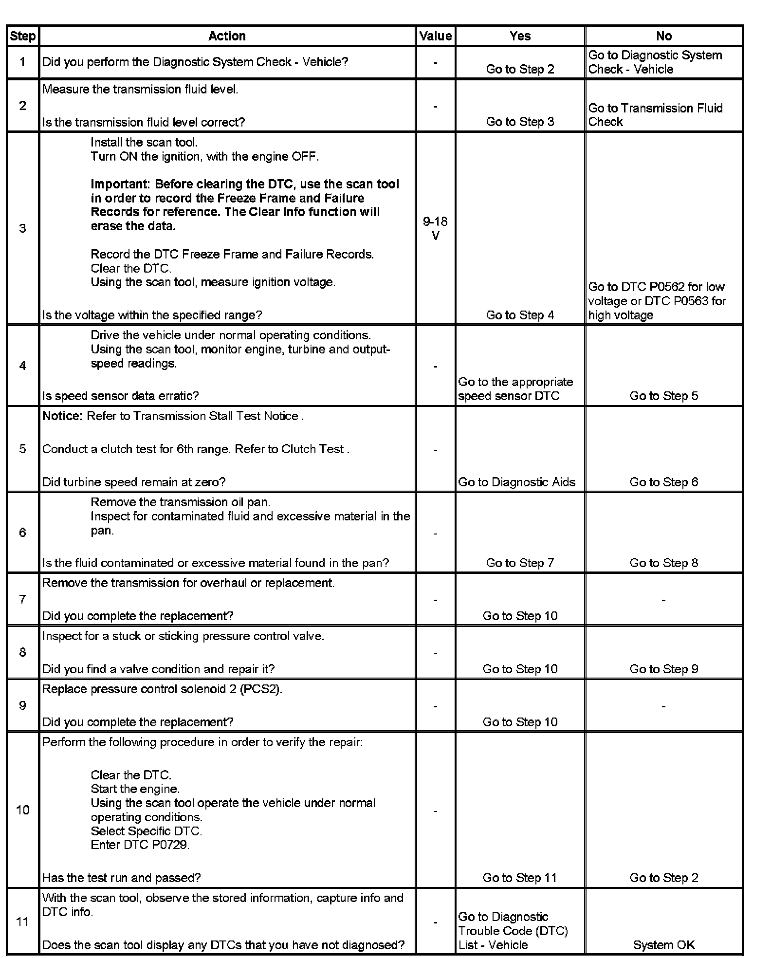 DTC P0729 sets when the calculated 6th range ratio, steady state, differs from the known 6th range ratio.