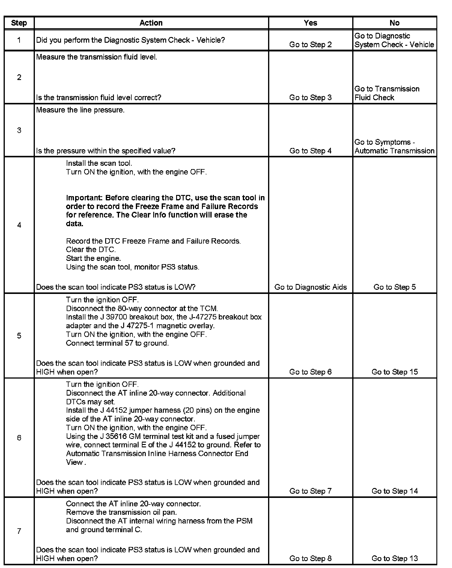 The pressure switch manifold (PSM) is a multiple-switch assembly made up of 3 normally open (N/O) and 1 normally closed (N/C) pressure switches. The pressure switch 3 (PS3) monitors shift solenoid valve 3 (SS3) positioning and relays it to the transmission control module (TCM). When PS3 is in the open state, SS3 should be in the destroked position.