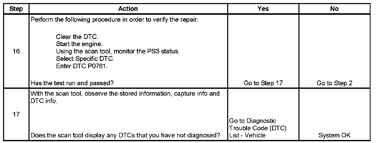 DTC P0761 sets when SS3 is commanded ON and PS3 status remains OFF for 5 seconds, depending on fluid temperature.