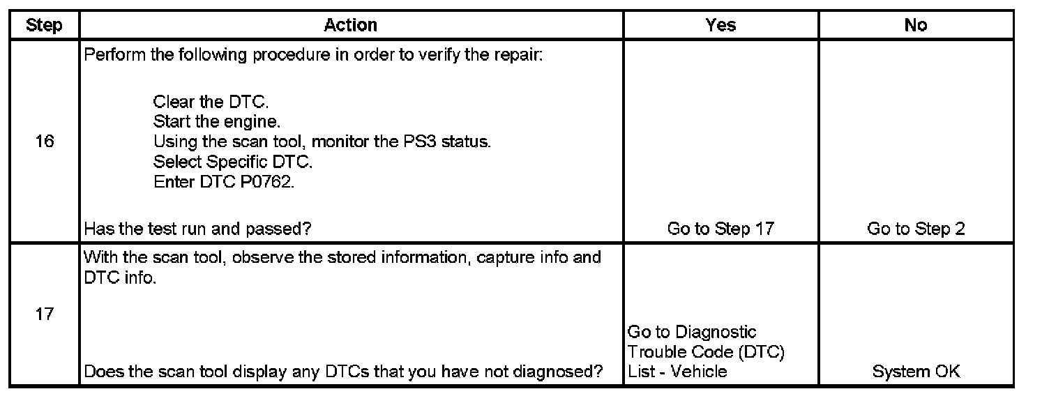 DTC P0762 sets when SS3 is commanded OFF and PS3 status remains ON for 2-16 seconds, depending on fluid temperature.