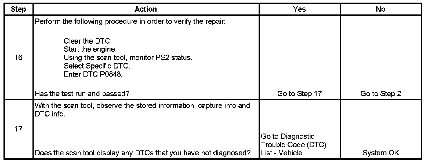 DTC P0848 sets during steady state operation, when shift solenoid 2 (SS2) is commanded ON and PS2 indicates OFF for 125 milliseconds.