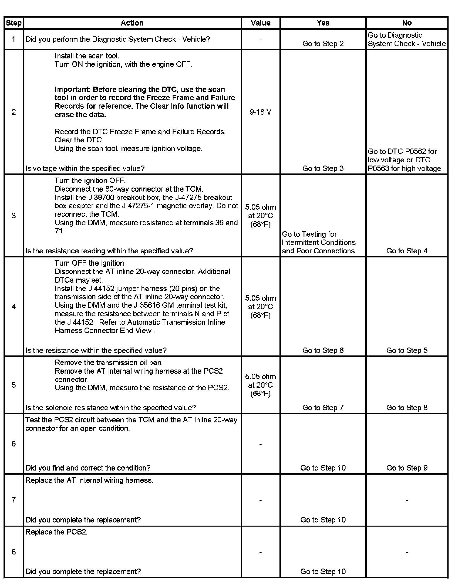 The pressure control solenoid 2 (PCS2) is a pressure proportional to current (PCC) solenoid used to control on-coming, off-going and holding pressure to any 1 of the 5 clutches. The transmission control module (TCM) provides voltage to the PCS2, shift solenoid 1, 2, and 3 (SS1, SS2, and SS3) through a separate solid-state device called high side driver 2 (HSD2). The TCM regulates the amount of current to the PCS2 by switching the low side driver ON and OFF.