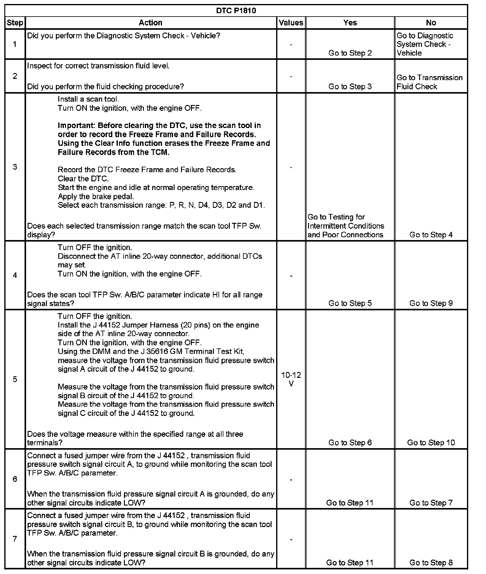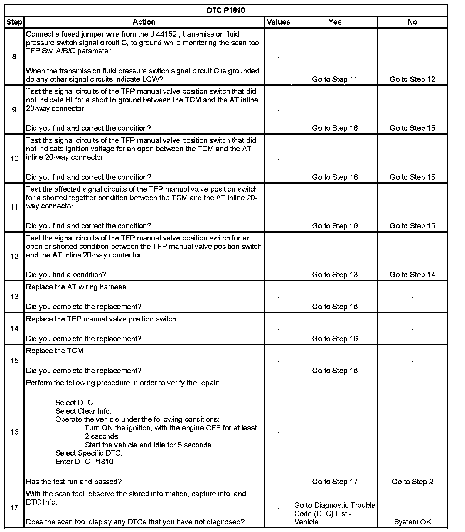 DTC P1810 sets when the TCM detects an invalid TFP manual valve position switch state for 60 seconds.