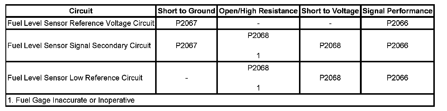 The primary fuel level sender and the secondary fuel level sender changes resistance based on fuel level. The engine control module (ECM) monitors the signal circuits of the primary fuel level sender and the secondary fuel level sender in order to determine the fuel level. When the fuel tank is full, the resistances of both fuel level senders are low and the ECM senses a low signal voltage on both the signal circuits of the primary fuel level sender and the secondary fuel level sender. When the fuel tanks are empty, the resistances of the fuel level senders are high and the ECM senses a high signal voltage. The ECM uses the signal circuits of the primary fuel level sender and the secondary fuel level sender in order to calculate the percentage of remaining fuel in the tank. The ECM sends the fuel level percentage via GMLAN serial data circuit to the instrument cluster in order to control the fuel gage. The fuel information is also used for misfire and evaporative emission (EVAP) diagnostics.