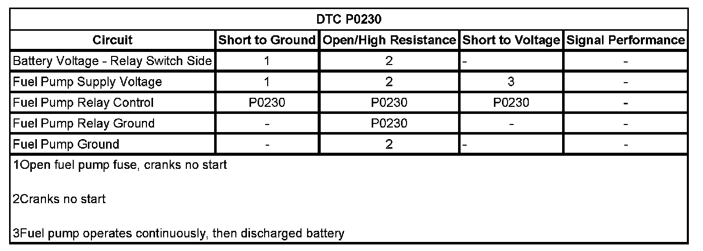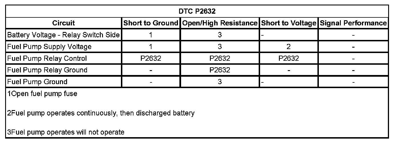 The control module monitors the voltage on the fuel pump relay control circuit. If the control module detects an incorrect voltage on the fuel pump relay control circuit, a fuel pump relay control DTC sets.