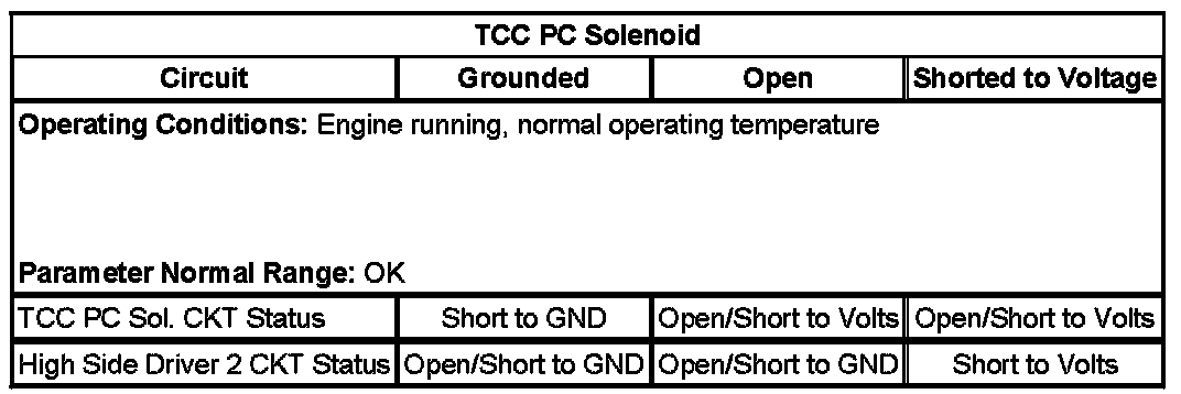 3. Observe the scan tool data parameter TCC PC Sol. CKT Status, the parameter should display OK.