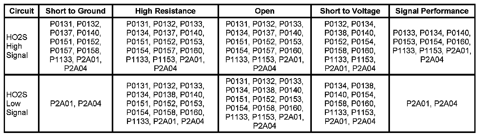 DTC P0153, P0154, P0160, P1153, P2A03, or P2A04