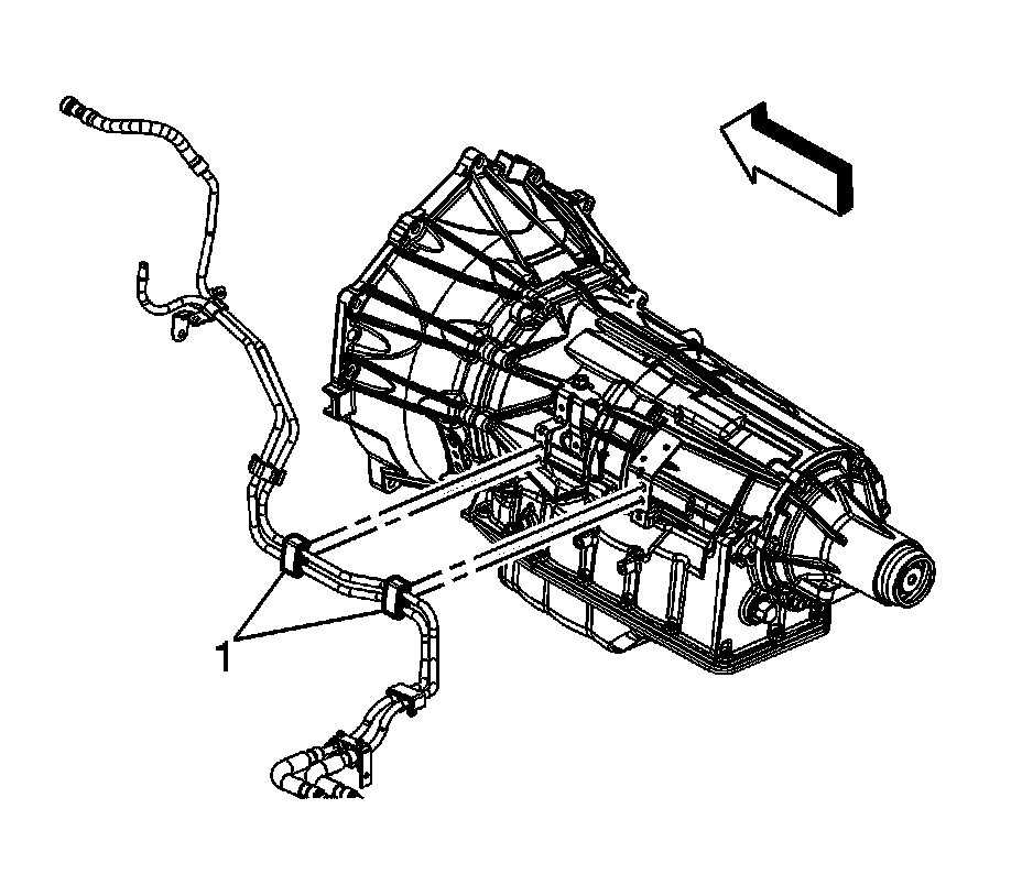8. Remove the fuel line clips (1) from the bracket on the automatic transmission.