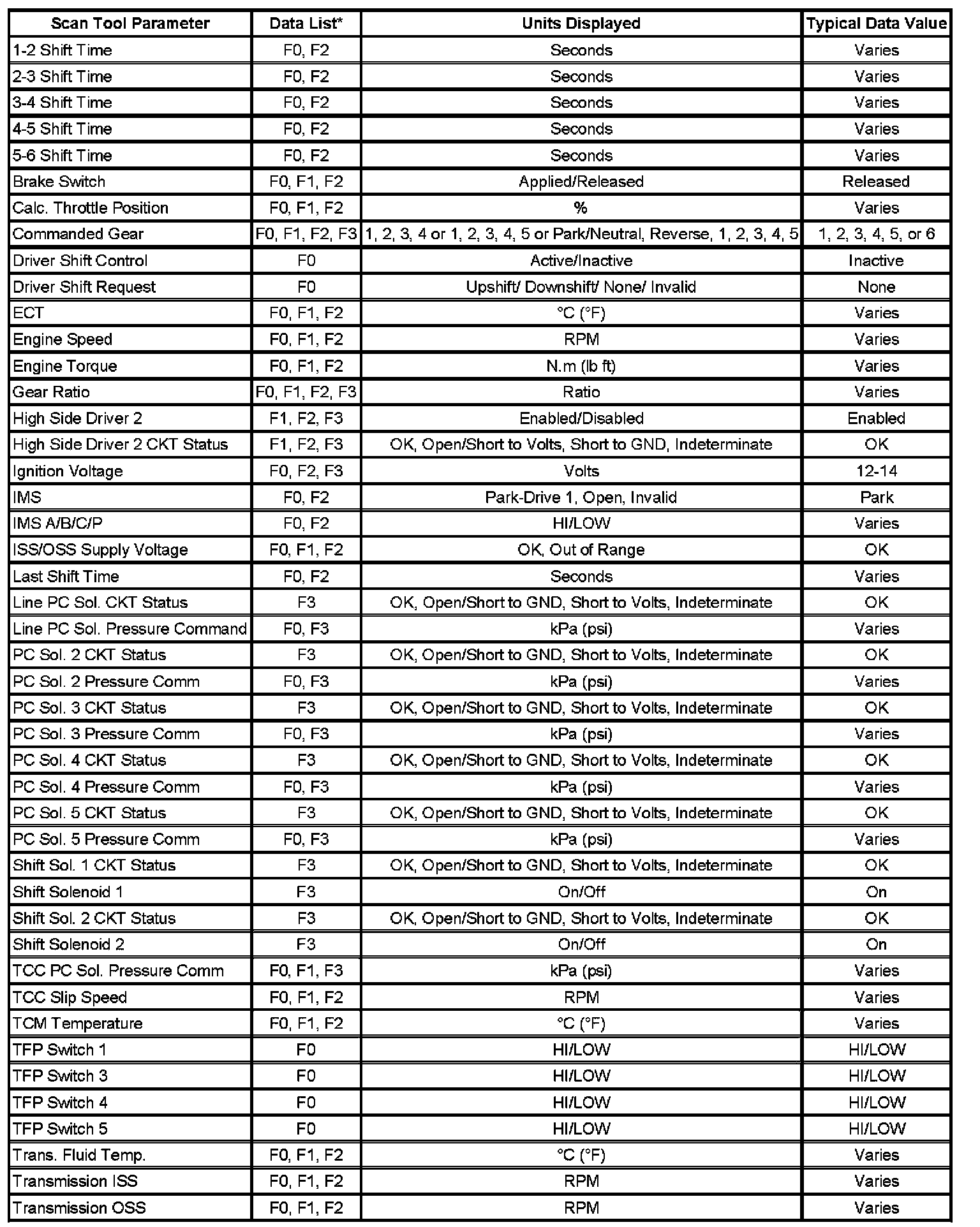 Only the parameters listed below are used in this manual for diagnosing. If a scan tool displays other parameters, the values are not recommended by General Motors for use in diagnosis.