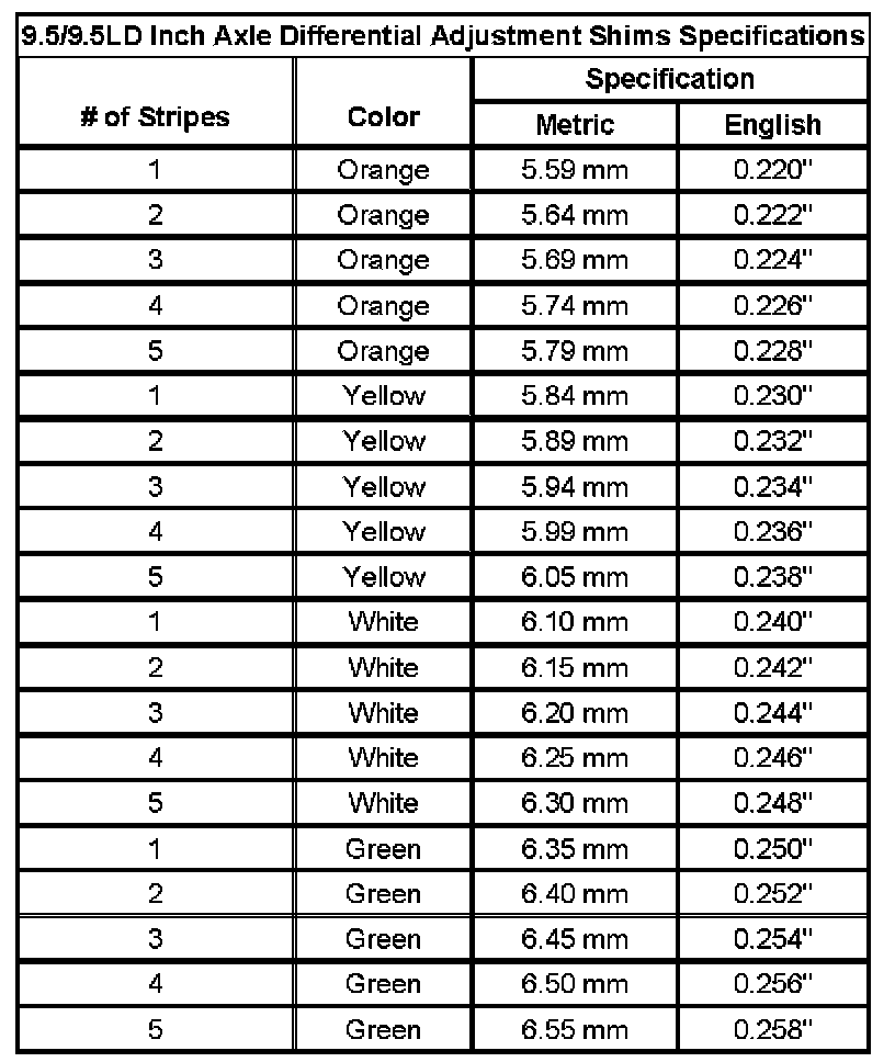 9.5/9.5LD Inch Axle Differential Adjustment Shims Specifications: