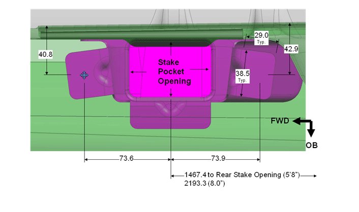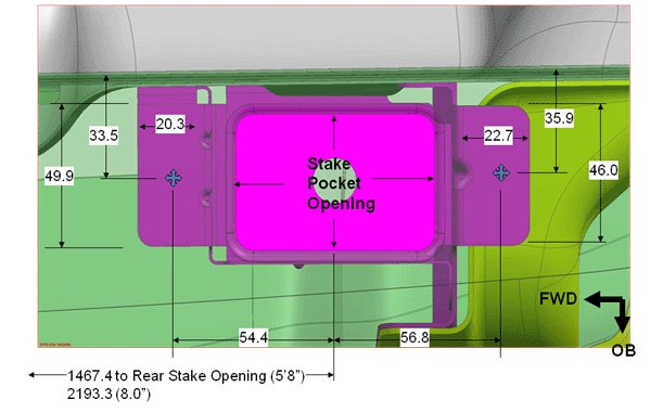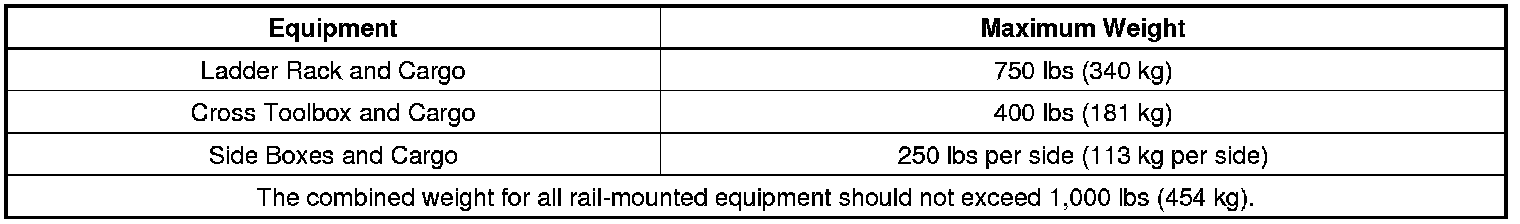 The pickup box was designed for the use of add-on equipment. However there are specific mounting points that must be used along with weight restrictions. Refer to the following Chart 1 - Weight Restrictions for Pickup Box Add-Ons. Structural members have been added to provide load paths directly to the platform cross-sills and into the vehicle frame. Aftermarket accessories should take advantage of these intended load paths as detailed below in Figures 1-4.