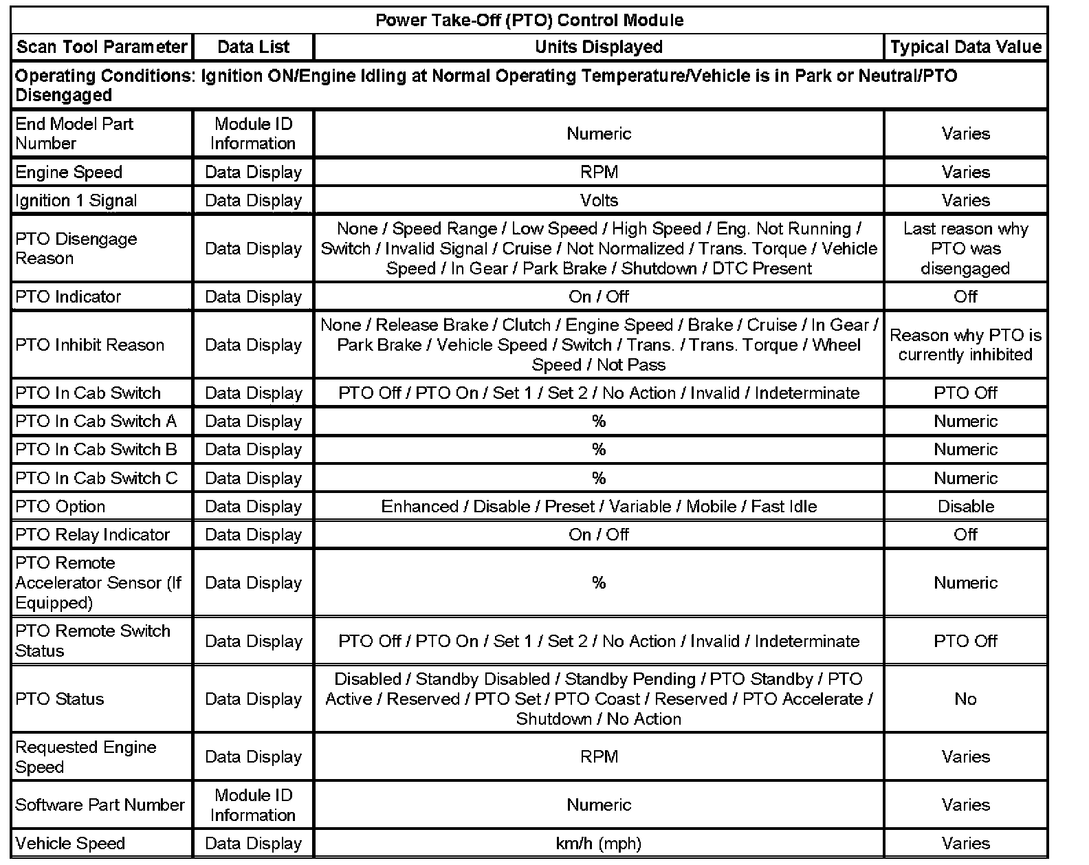 The scan tool data lists contain all of the power take-off (PTO) related parameters that are available on the scan tool. The parameters in the list are arranged in alphabetical order. The data list column indicates the location of the parameter within the scan tool menu selections.