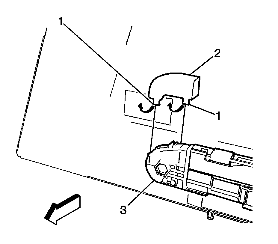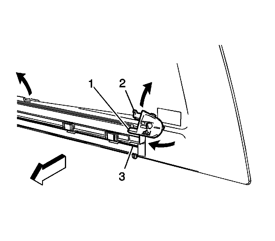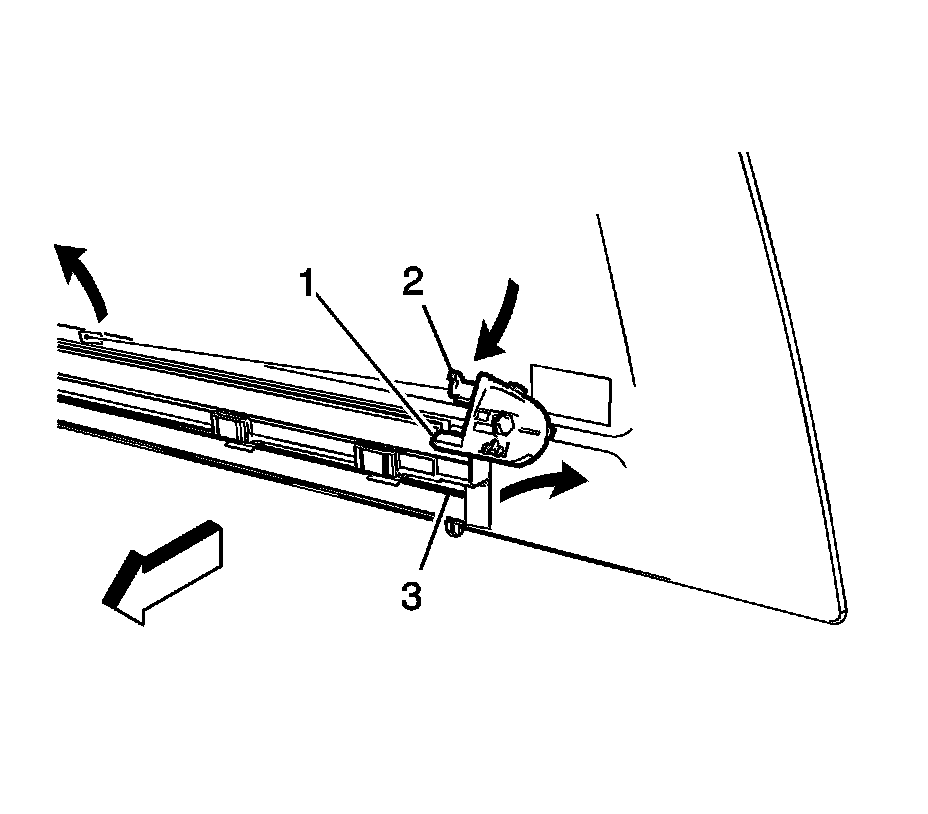 Important: Use a suitable tool to release the tabs (1) from the rear sliding window pulley (3).