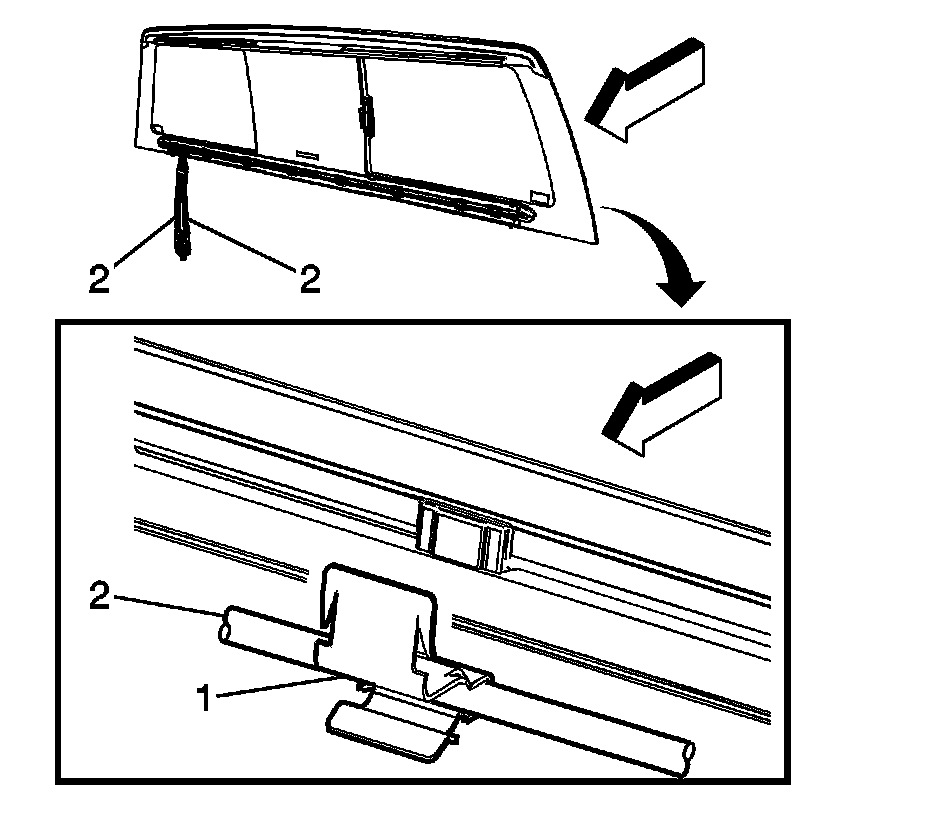 Important: Use a suitable tool to lift upward on the rear sliding window stops (1) to remove.
