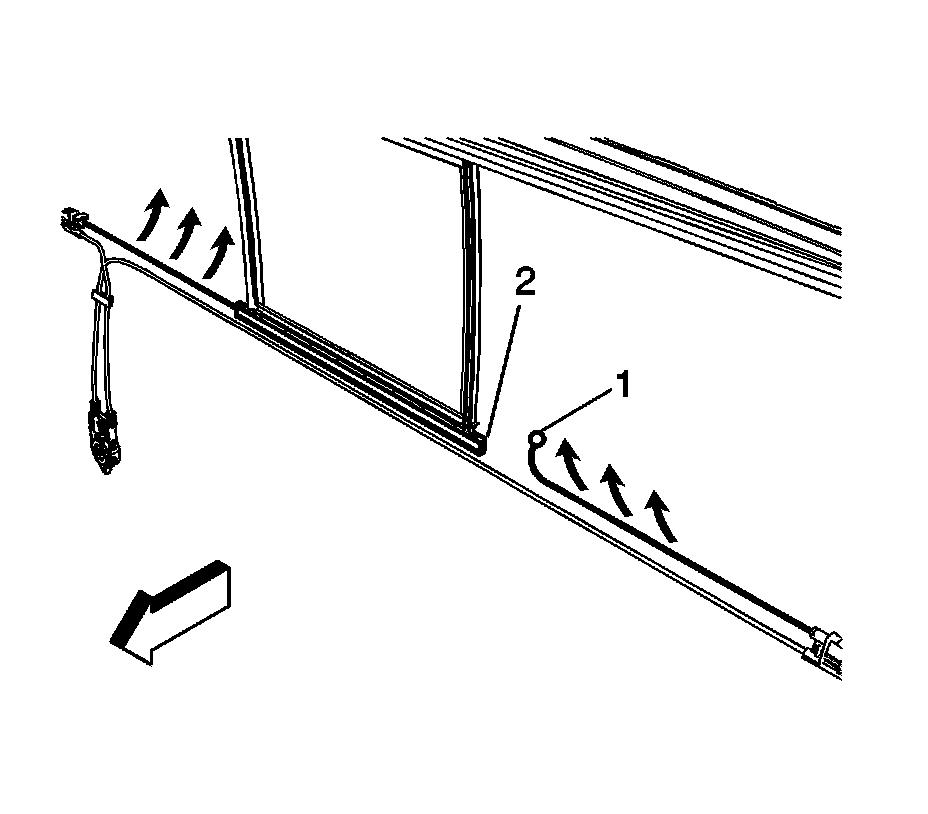 12. Install the regulator cables (2) to the retainers (1) across the bottom edge of the window frame.