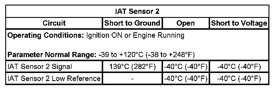 The IAT sensor 2 is greater than 148°C (298°F) for greater than 1 second. This is equal to or less than 0.10 volt on the IAT sensor 2 signal circuit as measured by the ECM.