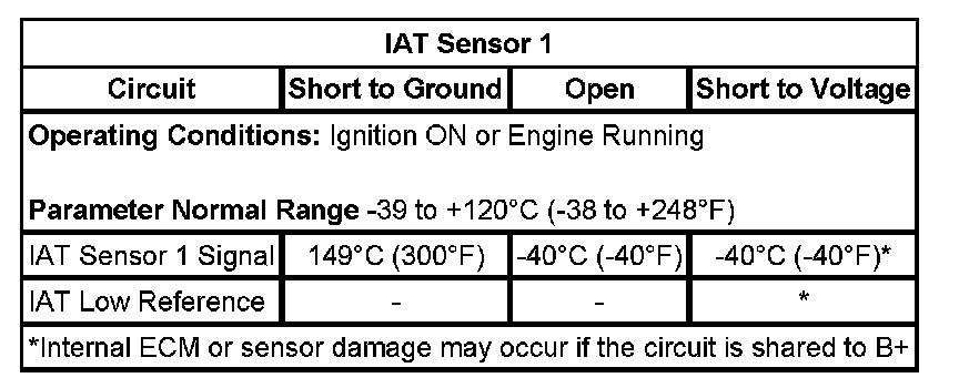 The IAT Sensor parameter is warmer than 148°C (299°F) for greater than 1 second. This is equal to or less than 0.10 volt on the IAT signal circuit as measured by the ECM.