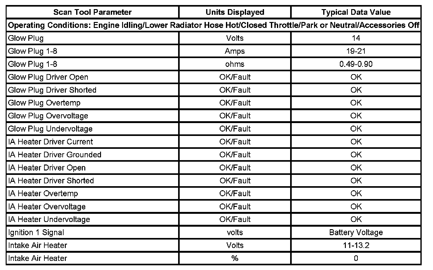 The GPCM Scan Tool Data List contains all glow plug control module related parameters that are available on the scan tool. The list is arranged in alphabetical order.