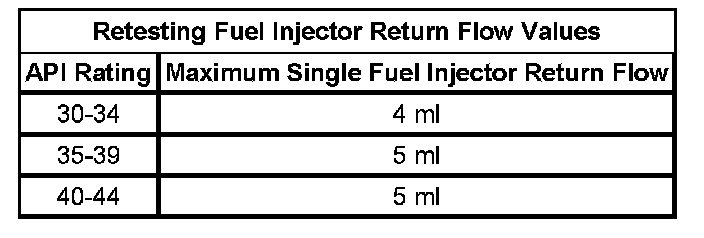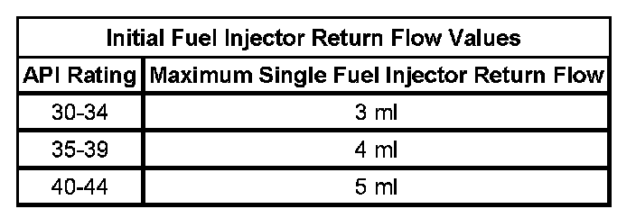 The fuel return from the fuel injectors to the tank will vary based on the API value of the fuel. Measure the Fuel API with the Diesel Fuel Quality Tester. For this reason the Fuel System Diagnosis - High Pressure Side values will vary for identifying a fuel injector or fuel pump concern. Use the following tables when referred to by the diagnostic. The first table is to be used during the initial diagnosis to identify the worst fuel injectors. After the fuel injectors that fail the first part of the test are capped off, the return flow from each uncapped fuel injector must be measured again. This is because the fuel system is returning less fuel to the tank, and thus the fuel pressure is higher during the retest. Failure to use the correct table may result in the replacement of good fuel injectors.