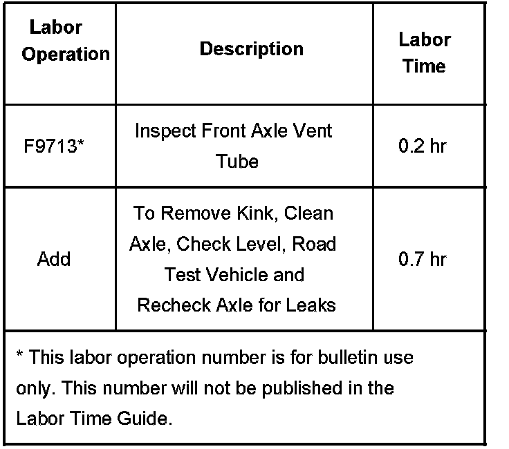 Prior to vehicle assembly, the axle vent tube is folded over and secured with tape to prevent axle fluid leakage during shipping. On some of these vehicles, the tape may not have been removed during vehicle assembly. Remove the tape from the vent tube and then unfold the vent tube to ensure proper vent operation.