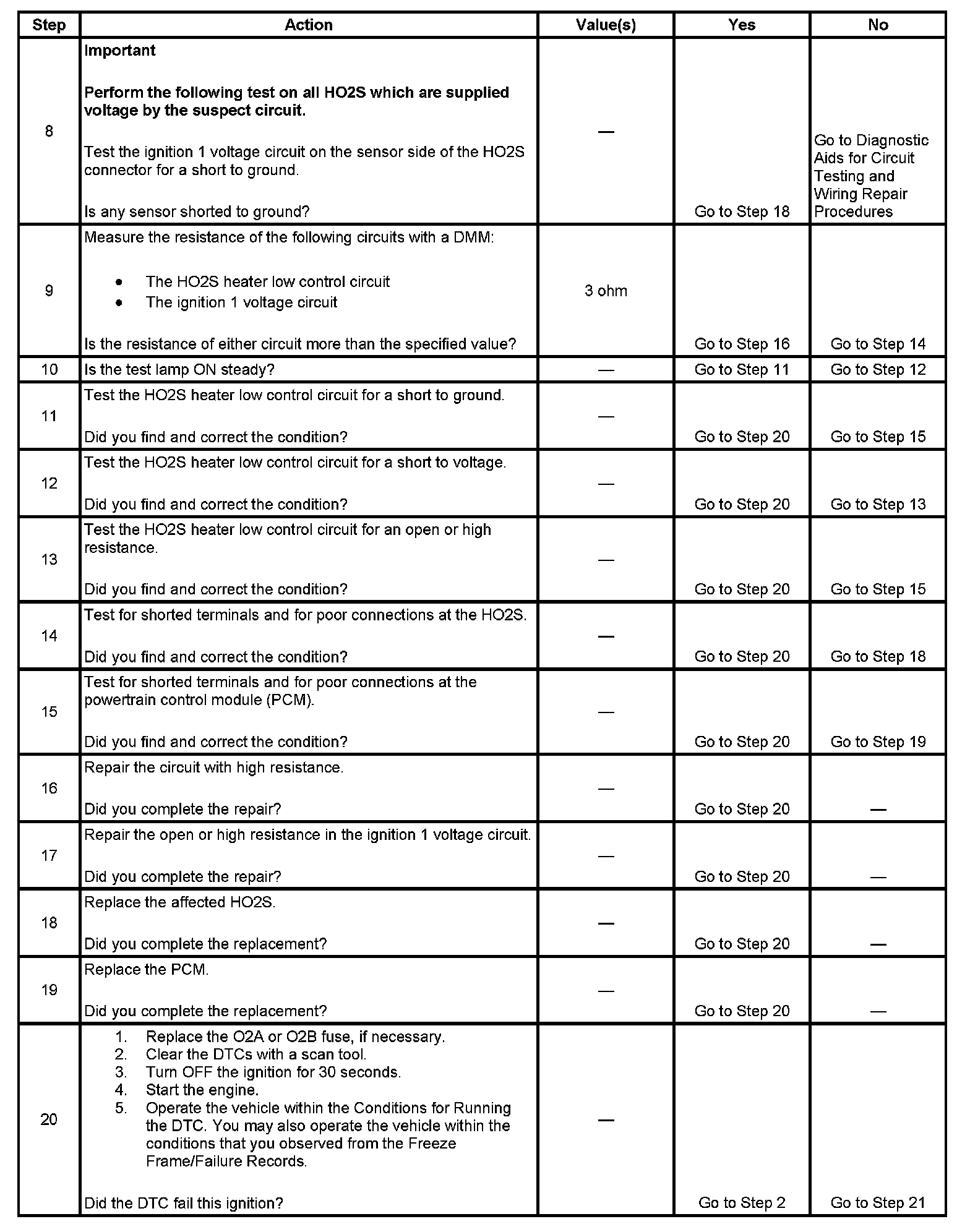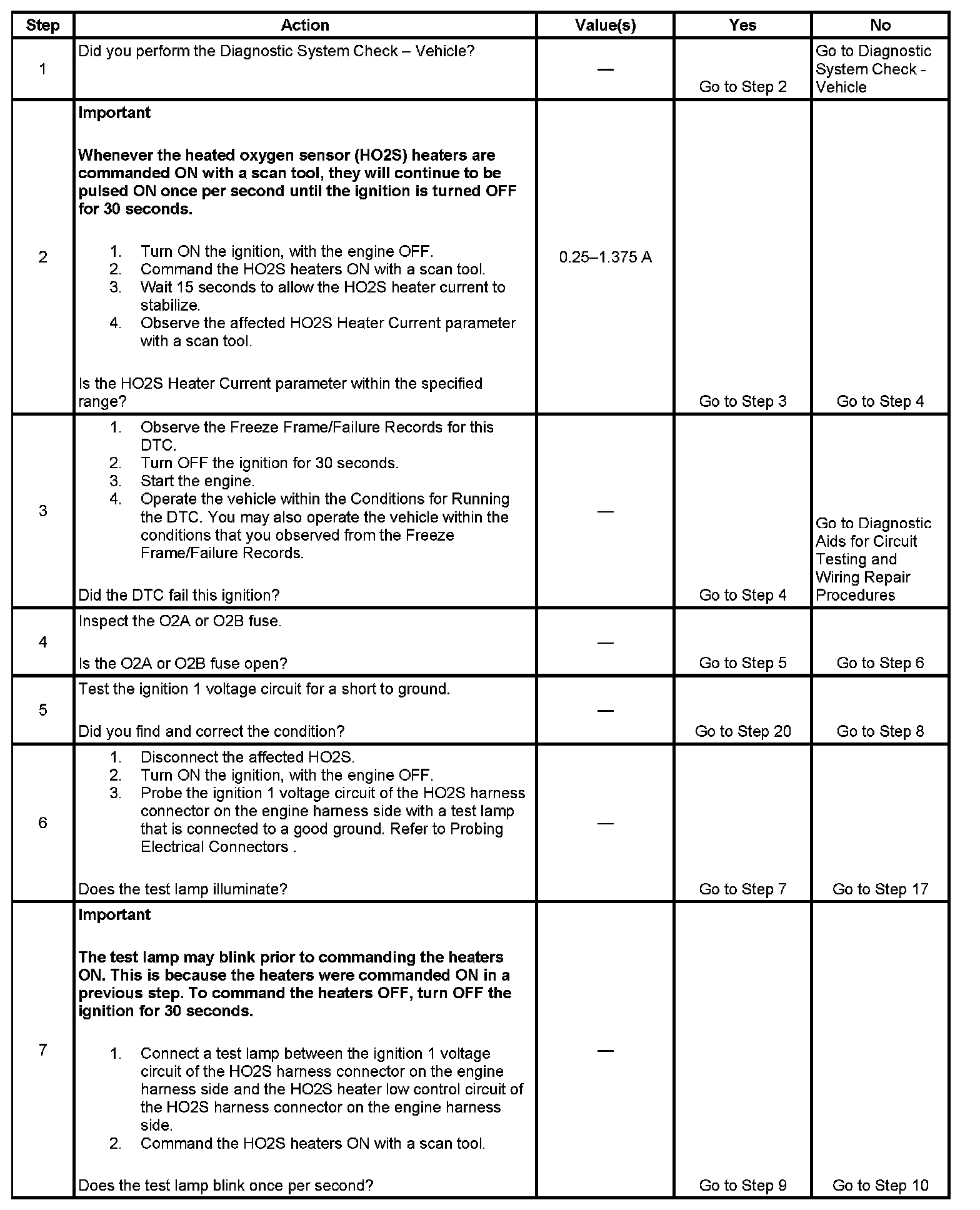The heated oxygen sensor (HO2S) must reach operating temperature to provide an accurate voltage signal. A heating element inside the HO2S minimizes the time required for the sensor to reach operating temperature. Voltage is provided to the heater by the ignition 1 voltage circuit through a fuse. With the engine running, ground is provided to the heater by the HO2S heater low control circuit, through a low side driver within the powertrain control module (PCM). The PCM commands the heater ON or OFF to maintain a specific HO2S operating temperature range. The PCM determines the temperature by measuring the current flow through the heater. When the heater is in the ON state, the PCM will pulse the heater OFF for a duration of 50 ms, once per second. The PCM calculates the heater resistance on a cold start. This diagnostic will only run once per ignition cycle. If the PCM detects that the heater calculated resistance is not within the expected range, the following DTCs will set: