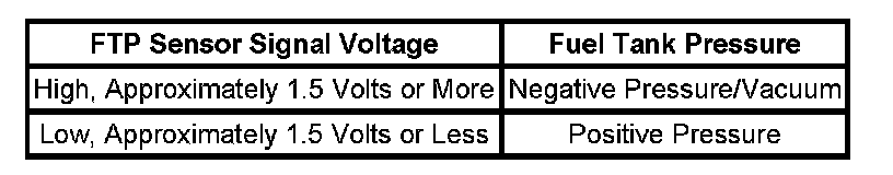 The table illustrates the relationship between the FTP sensor signal voltage and the EVAP system pressure/vacuum.