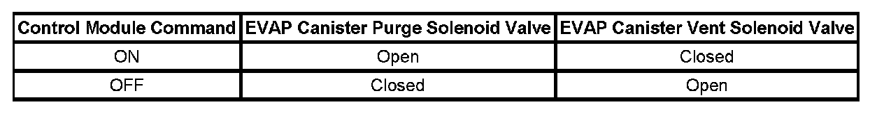 The table illustrates the relationship between the ON and OFF states, and the OPEN or CLOSED states of the EVAP canister purge and vent solenoid valves.