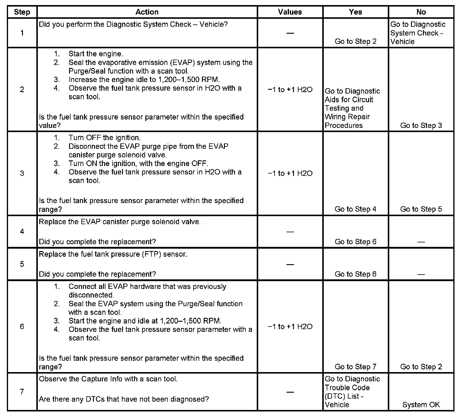 This DTC tests for undesired intake manifold vacuum flow to the evaporative emission (EVAP) system. The control module seals the EVAP system by commanding the EVAP canister purge solenoid valve Closed and the EVAP canister vent solenoid valve Closed. The control module monitors the fuel tank pressure (FTP) sensor to determine if a vacuum is being drawn on the EVAP system. If vacuum in the EVAP system is more than a predetermined value within a predetermined time, this DTC sets.