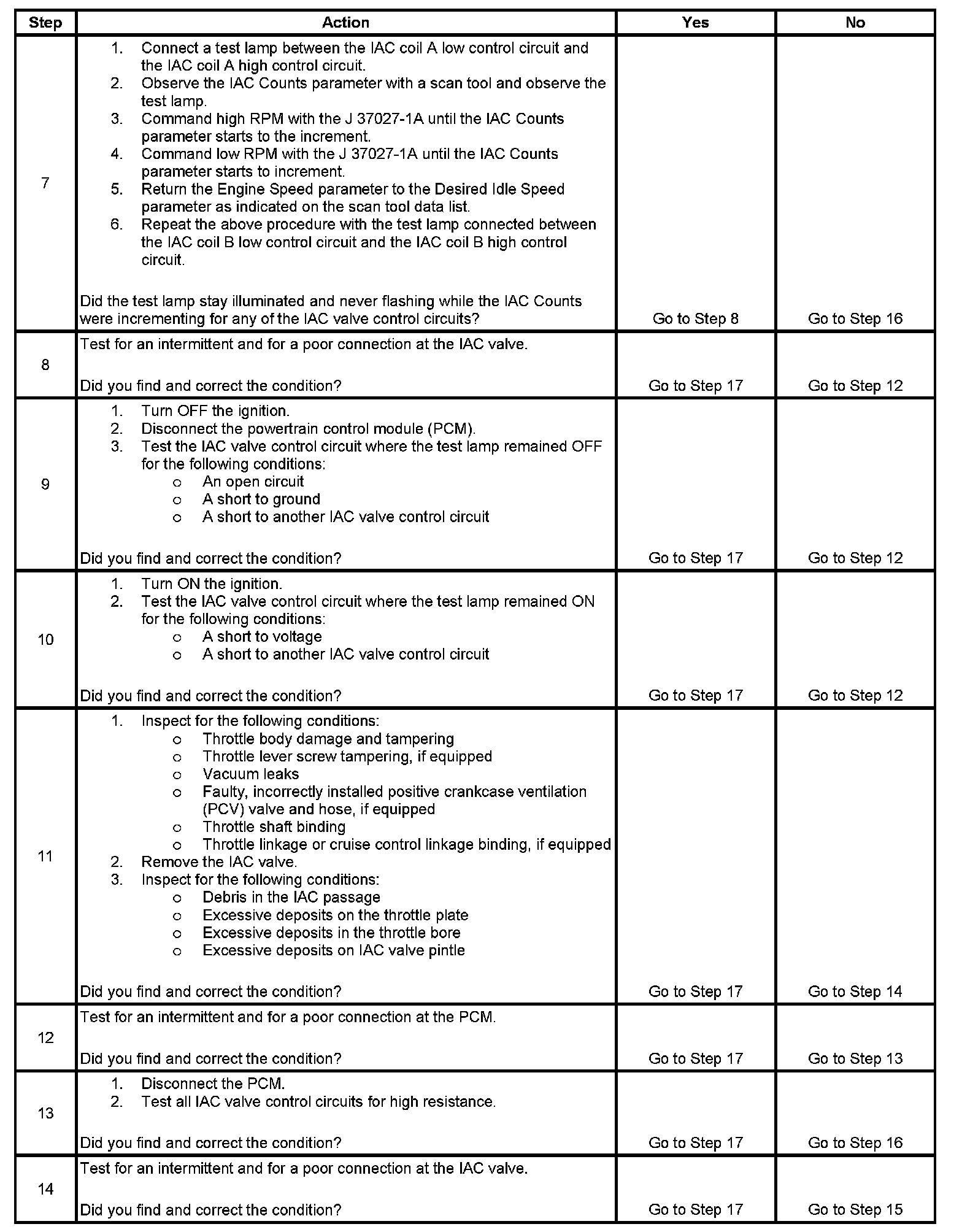 7. This test will determine the ability of the PCM to provide the IAC valve control circuits with a ground. On a normally operating system, the test lamp should not flash while the IAC Counts are incrementing.