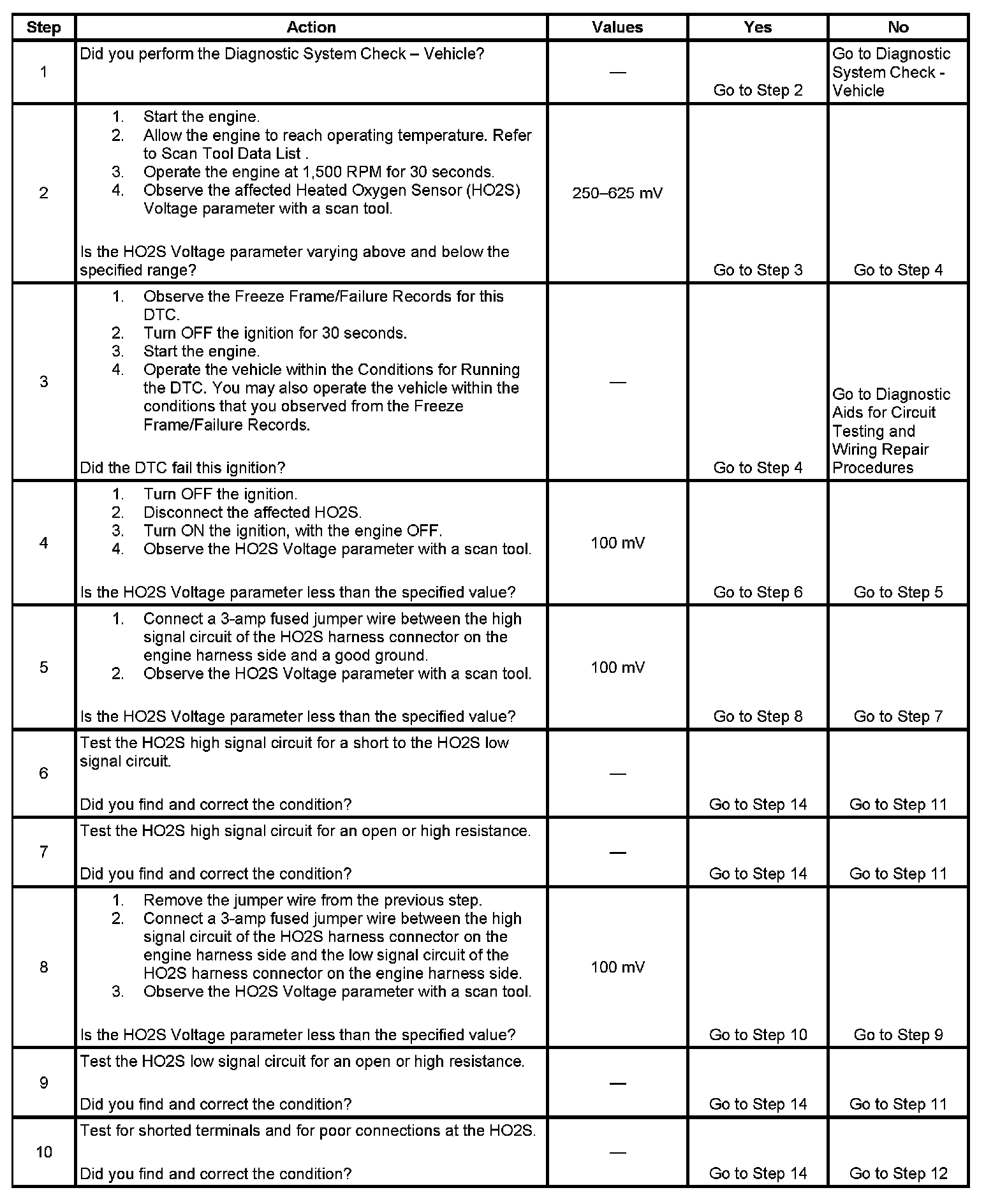 Heated oxygen sensors (HO2S) are used for fuel control and post catalyst monitoring. Each HO2S compares the oxygen content of the surrounding air with the oxygen content in the exhaust stream. The HO2S must reach operating temperature to provide an accurate voltage signal. Heating elements inside the HO2S minimize the time required for the sensors to reach operating temperature. The powertrain control module (PCM) supplies the HO2S with a reference, or bias, voltage of about 450 mV. When the engine is first started the PCM operates in Open Loop, ignoring the HO2S voltage signal. Once the HO2S reaches operating temperature and Closed Loop is achieved, the HO2S generates a voltage within a range of 0-1,000 mV that fluctuates above and below bias voltage. High HO2S voltage indicates a rich exhaust stream. Low HO2S voltage indicates a lean exhaust stream. This diagnostic will only run once per ignition cycle. The PCM monitors the number of rich-to-lean and lean-to-rich transitions. If the PCM detects that the number of transitions were less than a specified value, DTC P1133 sets for HO2S bank 1 sensor 1, or DTC P1153 sets for HO2S bank 2 sensor 1.