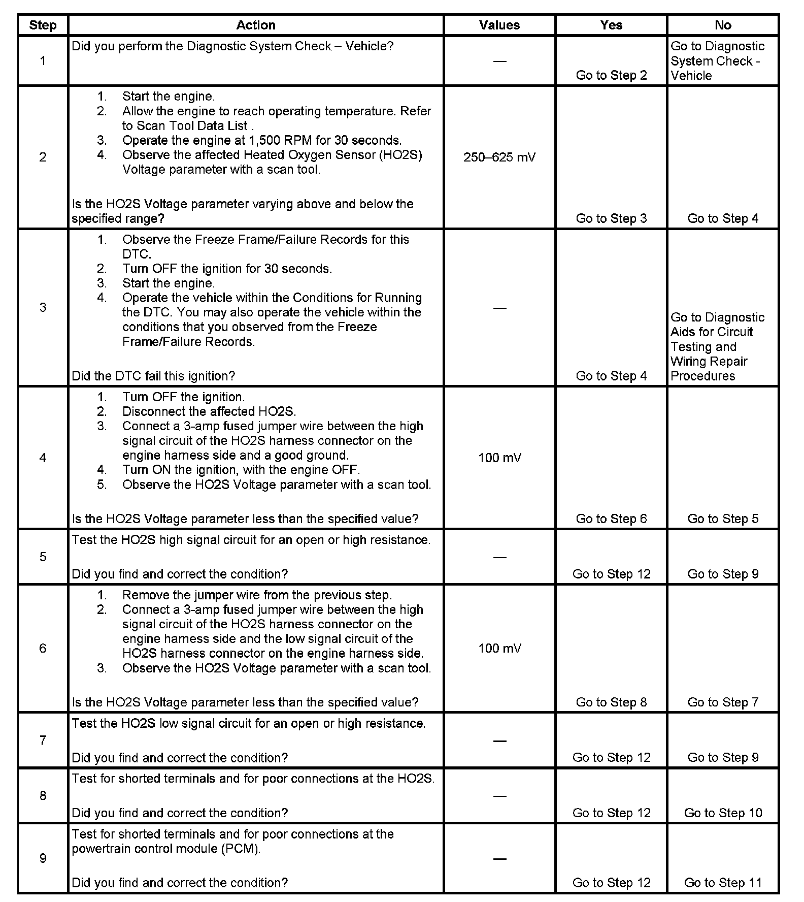 Heated oxygen sensors (HO2S) are used for fuel control and post catalyst monitoring. Each HO2S compares the oxygen content of the surrounding air with the oxygen content in the exhaust stream. The HO2S must reach operating temperature to provide an accurate voltage signal. Heating elements inside the HO2S minimize the time required for the sensors to reach operating temperature. The powertrain control module (PCM) supplies the HO2S with a reference, or bias, voltage of about 450 mV. When the engine is first started the PCM operates in Open Loop, ignoring the HO2S voltage signal. Once the HO2S reaches operating temperature and Closed Loop is achieved, the HO2S generates a voltage within a range of 0-1,000 mV that fluctuates above and below bias voltage. High HO2S voltage indicates a rich exhaust stream. Low HO2S voltage indicates a lean exhaust stream. This diagnostic will only run once per ignition cycle. The PCM monitors the rich-to-lean and lean-to-rich transition time. A transition is defined as, the HO2S voltage changes from above 625 mV to below 250 mV or from below 250 mV to above 625 mV. If the PCM detects that the difference between the rich-to-lean average transition time and lean-to-rich average transition time is more than a specified value, DTC P1134 sets for HO2S bank 1 sensor 1, or DTC P1154 sets for HO2S bank 2 sensor 1.