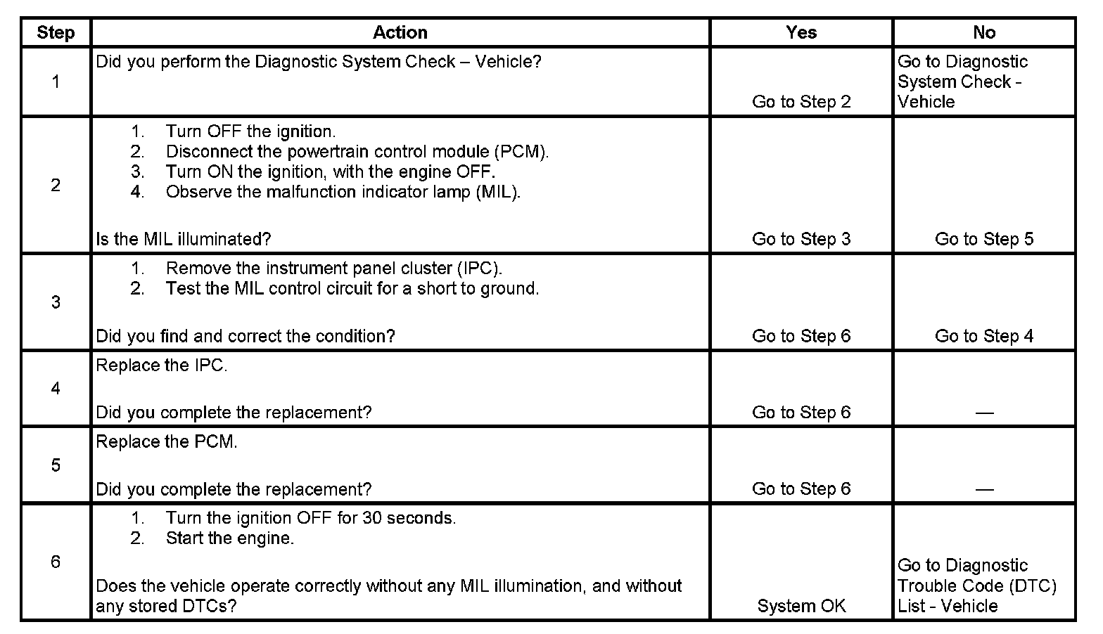 2. This step determines if the condition is with the MIL control circuit or the PCM.