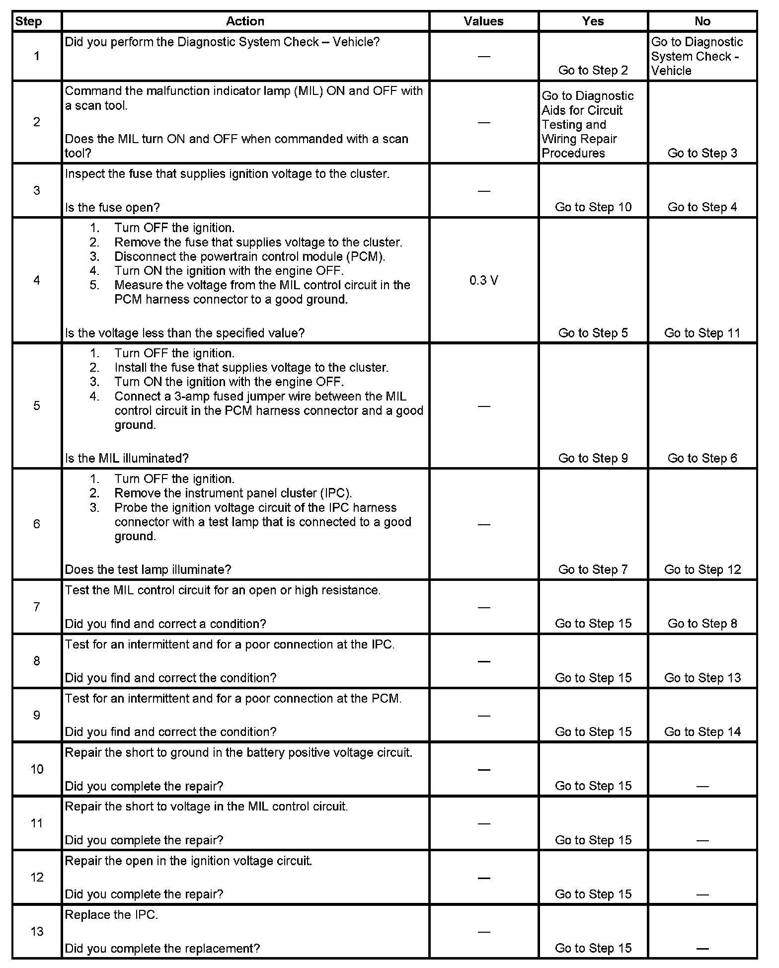 Ignition voltage is supplied to the malfunction indicator lamp (MIL). The powertrain control module (PCM) turns the MIL ON by grounding the MIL control circuit. There should be a steady MIL with the ignition ON and the engine OFF.