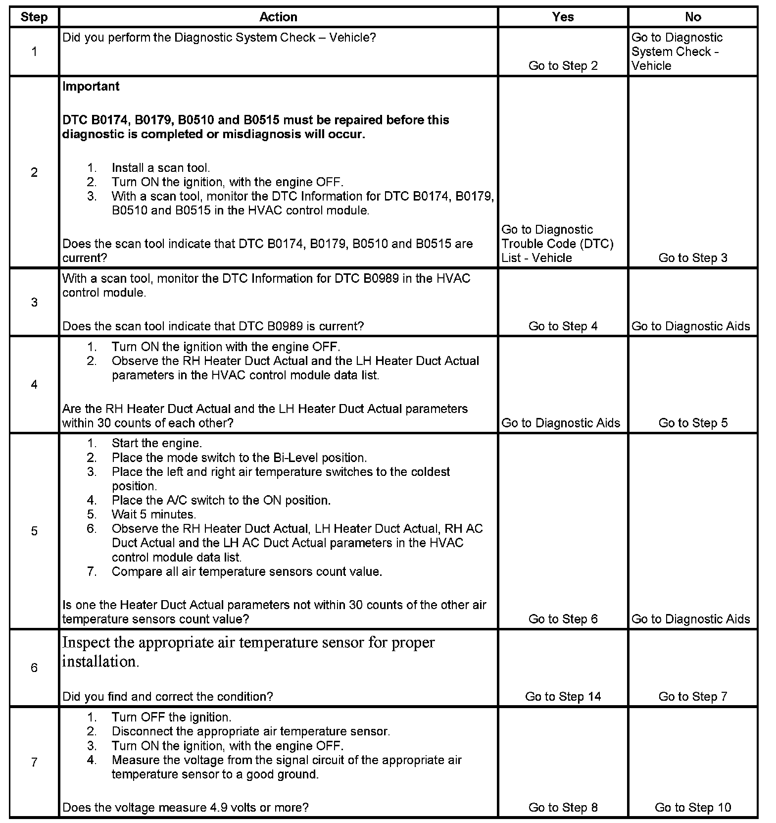 5. DTC B0989 sets only for the lower air temperature sensors. They HVAC system is placed in the Bi-Level mode and set to the coldest position to obtain a consistent temperature in the HVAC ducts. This action will determine if one of the air temperature sensors reading may be slightly higher or lower than the other air temperature sensors.