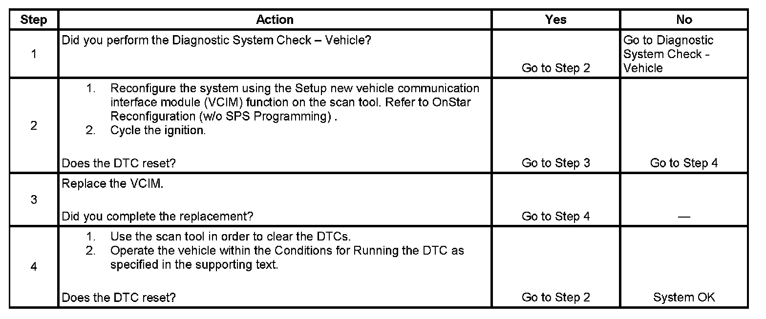 This DTC is set as current in all vehicle communication interface module (VCIM) service parts and has been implemented as a reminder to contact the OnStar(R) Call Center to properly update the customer's account once the new module has been installed. This call is initiated automatically after the installation of the replacement VCIM, and the completion of the Setup New VCIM procedure on the scan tool. No external circuits are involved.