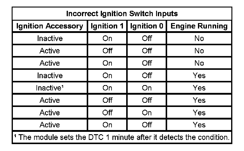 One of the 3 monitored ignition switch circuits has malfunctioned. The DTC will set, if one of the following situations is present: