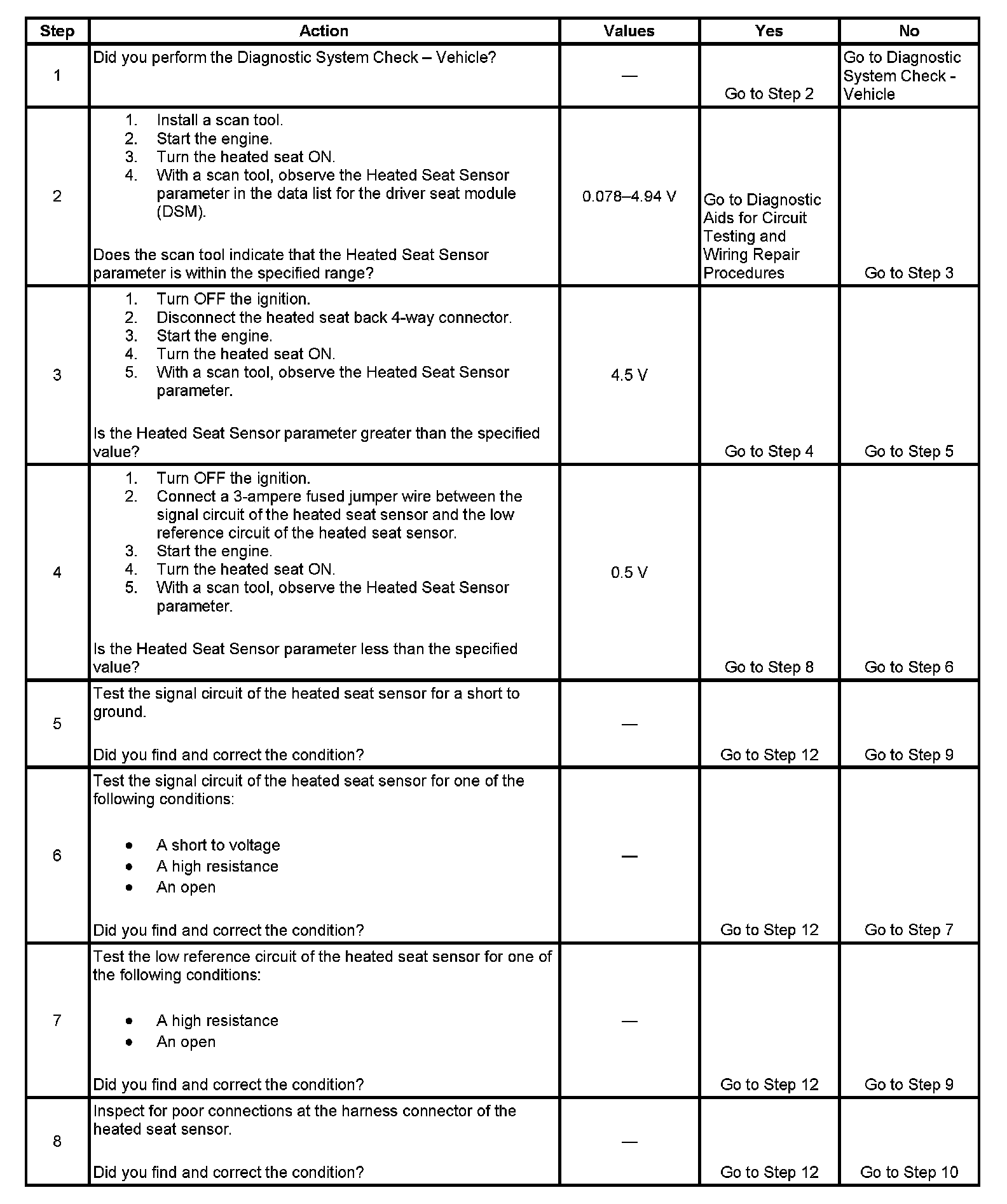 - The heated seat sensor signal circuit voltage to the DSM is greater than 4.94 volts for 30 seconds or more.