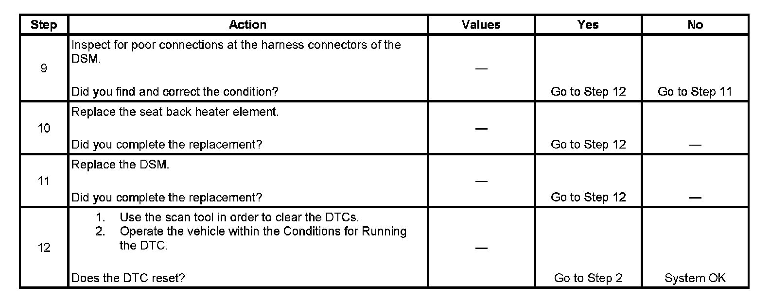 - When the fault is no longer present a history status DTC will be stored, and heated seat operation will be restored.