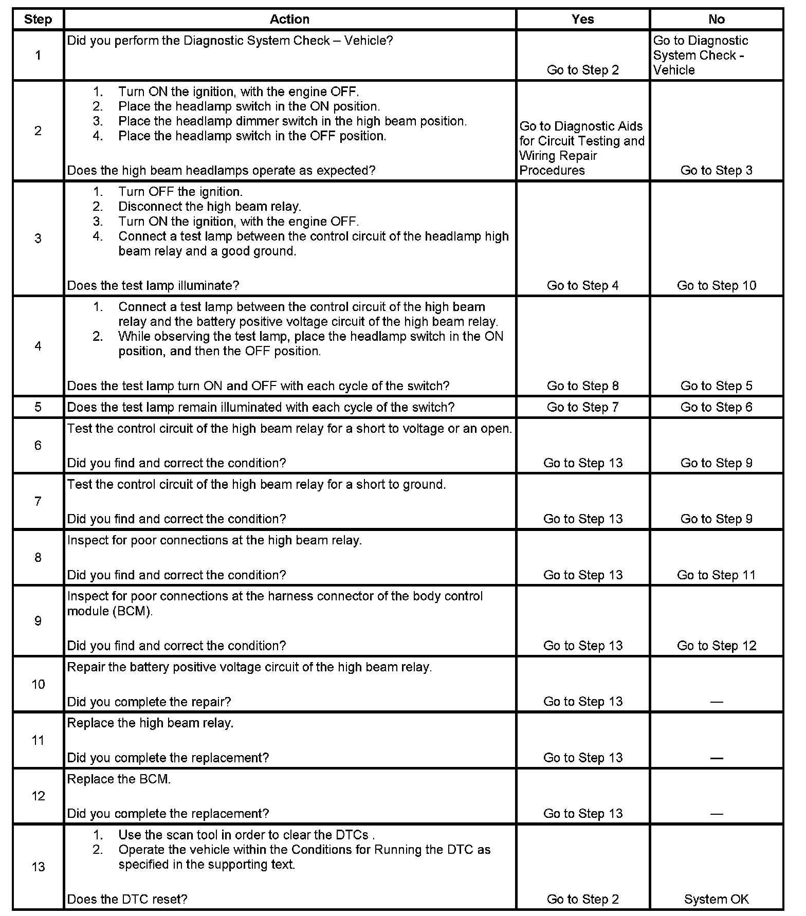- When the BCM receives a high beam headlamp ON command and the high beam headlamp relay control circuit is shorted to voltage or open
