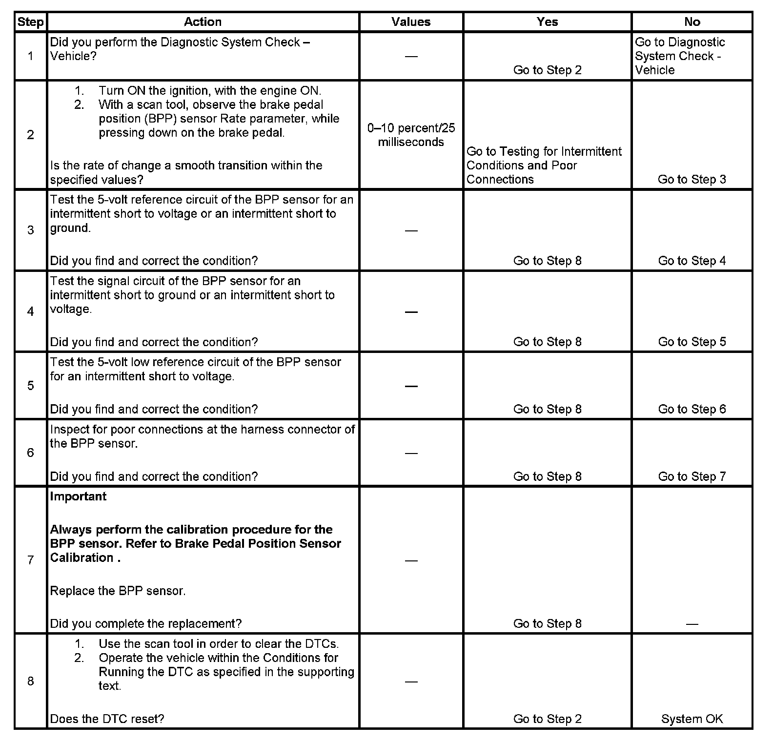 5. This step tests the 5-volt reference circuit of the brake pedal position sensor for an intermittent short.