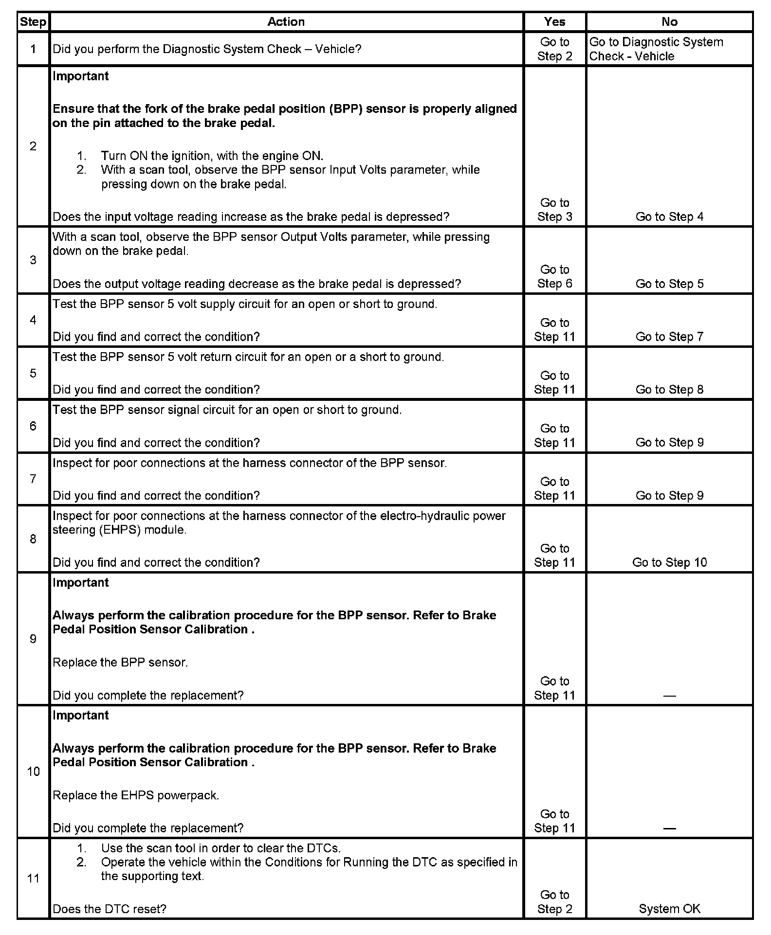 The EHPS excites the BPP sensor with the 5 volt reference and can determine the brake pedal position by reading the signal circuit output. The brake pedal travel is physically constrained to only use a portion of the BPP sensor. A portion of the BPP sensor is reserved for circuit low and circuit high guard bands. This diagnostic, DTC C0283, is used to determine if the sensor output reports a voltage in the low guard band.