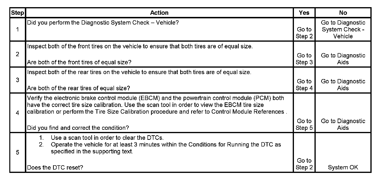 The EBCM detects that one wheel speed input is 10 percent greater than or 10 percent less than the other wheel speed inputs within 3.2 km (2 mi) of driving.