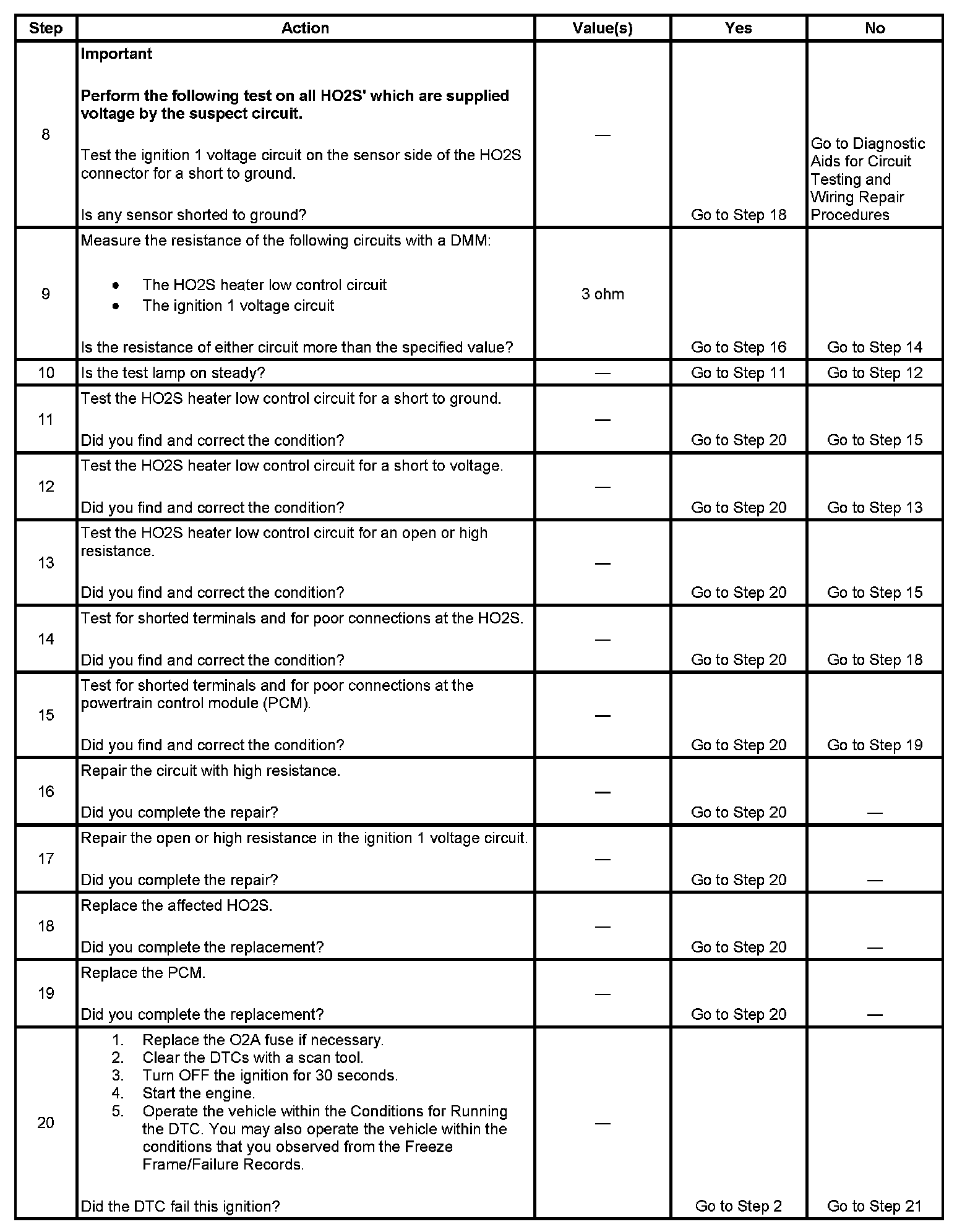 The heated oxygen sensor (HO2S) must reach operating temperature to provide an accurate voltage signal. A heating element inside the HO2S minimizes the time required for the sensor to reach operating temperature. Voltage is provided to the heater by the ignition 1 voltage circuit through a fuse. With the engine running, ground is provided to the heater by the HO2S heater low control circuit, through a low side driver within the powertrain control module (PCM). The PCM commands the heater ON or OFF to maintain a specific HO2S operating temperature range. The PCM determines the temperature by measuring the current flow through the heater. When the heater is in the ON state, the PCM will pulse the heater OFF for a duration of 50 ms, once per second. When the heater is in the OFF state, the PCM will pulse the heater ON for a duration of 50 ms, once per second. The PCM calculates the heater resistance on a cold start. This diagnostic will only run once per ignition cycle. If the PCM detects that the heater calculated resistance is not within an expected range, DTC P0053 sets for HO2S bank 1 sensor 1, or DTC P0059 sets for HO2S bank 2 sensor 1.