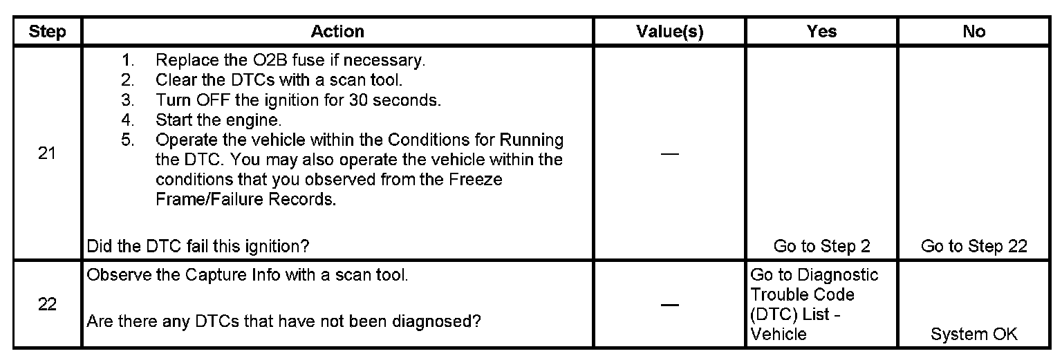 The heated oxygen sensor (HO2S) must reach operating temperature to provide an accurate voltage signal. A heating element inside the HO2S minimizes the time required for the sensor to reach operating temperature. Voltage is provided to the heater by the ignition 1 voltage circuit through a fuse. With the engine running, ground is provided to the heater by the HO2S heater low control circuit, through a low side driver within the powertrain control module (PCM). The PCM commands the heater ON or OFF to maintain a specific HO2S operating temperature range. The PCM determines the temperature by measuring the current flow through the heater. When the heater is in the ON state, the PCM will pulse the heater OFF for a duration of 50 ms, once per second. When the heater is in the OFF state, the PCM will pulse the heater ON for a duration of 50 ms, once per second. The PCM monitors the heater current with the engine running. This diagnostic will only run once per ignition cycle. If the PCM detects that the heater current is not within an expected range, DTC P0141 sets for HO2S bank 1 sensor 2, or DTC P0161 sets for HO2S bank 2 sensor 2.
