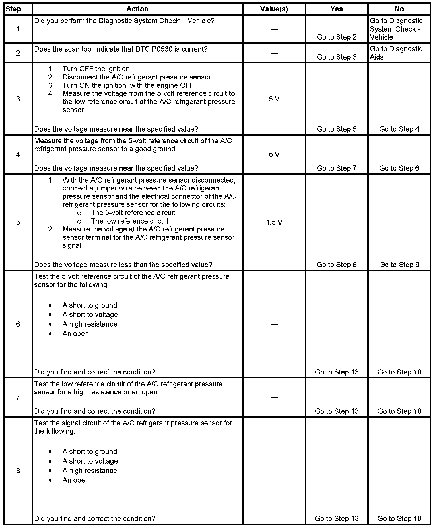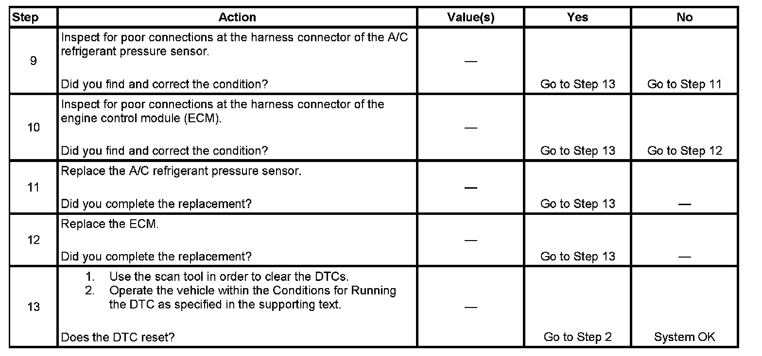 5. This step tests the ability of the A/C refrigerant pressure sensor to create a voltage signal for the ECM to monitor the A/C refrigerant pressure. Measure the voltage at the A/C refrigerant pressure sensor, if the voltage is measured at the connector for the sensor, misdiagnosis will occur.