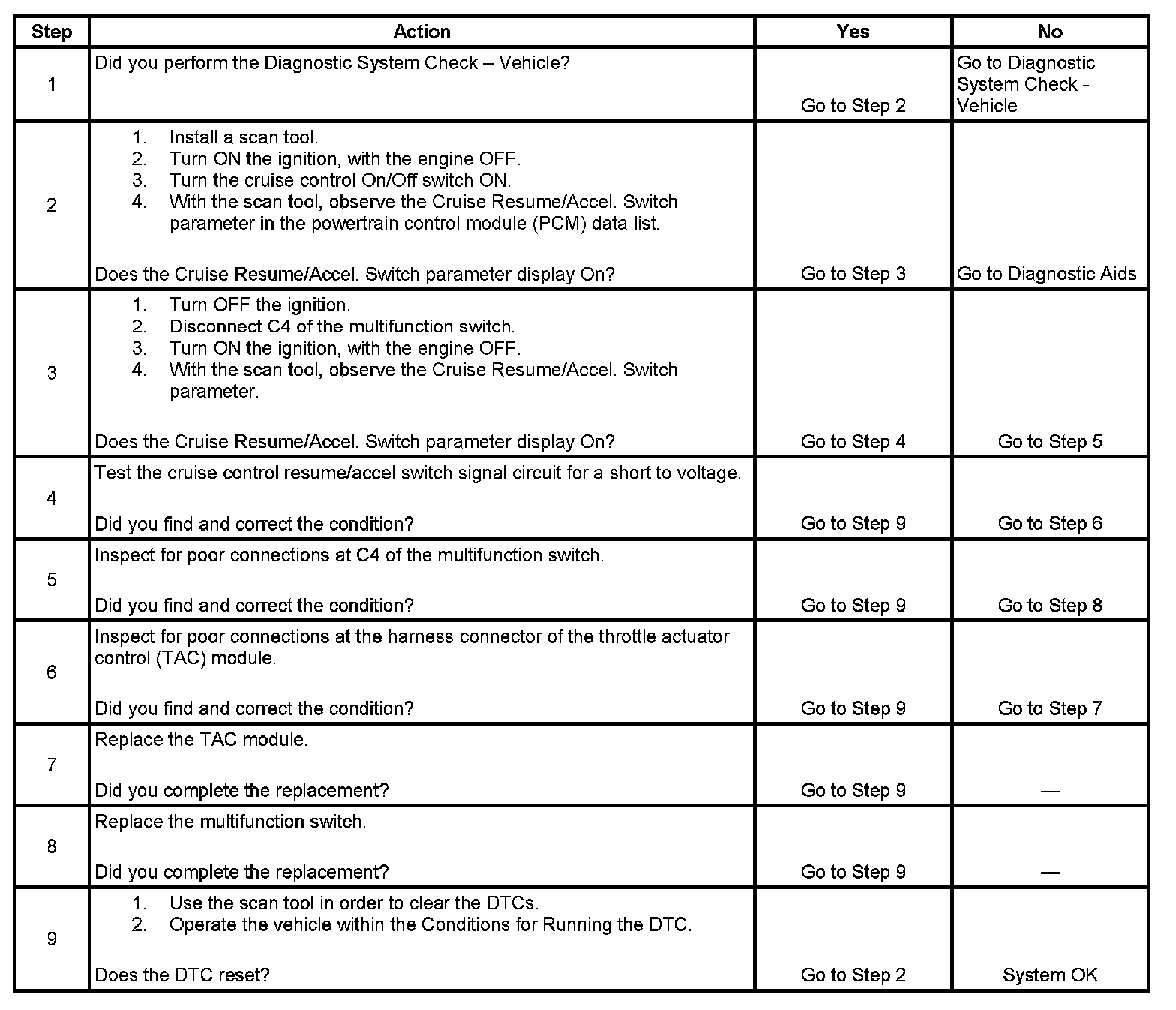 The cruise control Resume/Accel switch is an input to the throttle actuator control (TAC) module. The TAC module uses the cruise control resume/accel switch signal circuit in order to detect when the driver has requested to accelerate the set vehicle speed or to resume the cruise control system. The TAC module detects a voltage signal on the cruise control resume/accel switch signal circuit when the switch is applied. The TAC module sends a serial data signal to the powertrain control module (PCM) via the UART serial data circuit. This DTC sets if the PCM receives a serial data signal from the TAC module indicating that voltage is present on the cruise control resume/accel switch signal circuit for longer than 90 seconds.