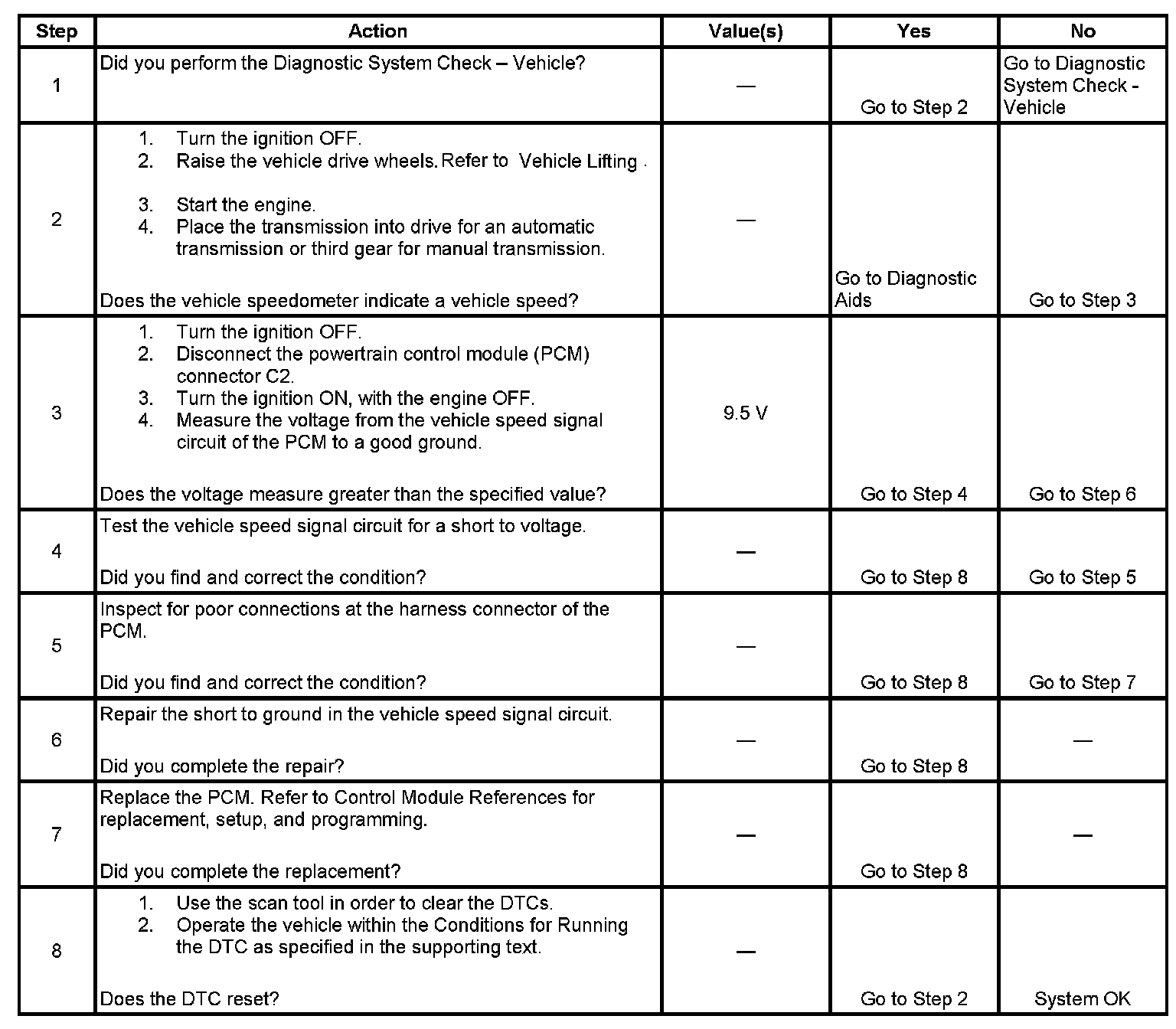 The powertrain control module (PCM) creates the vehicle speed output signal by pulsing the circuit to ground. The PCM pulses the circuit at the same rate as the vehicle speed signal input. The PCM monitors the voltage on the vehicle speed output circuit. If the PCM determines the voltage is out of the normal operating range, a DTC sets.