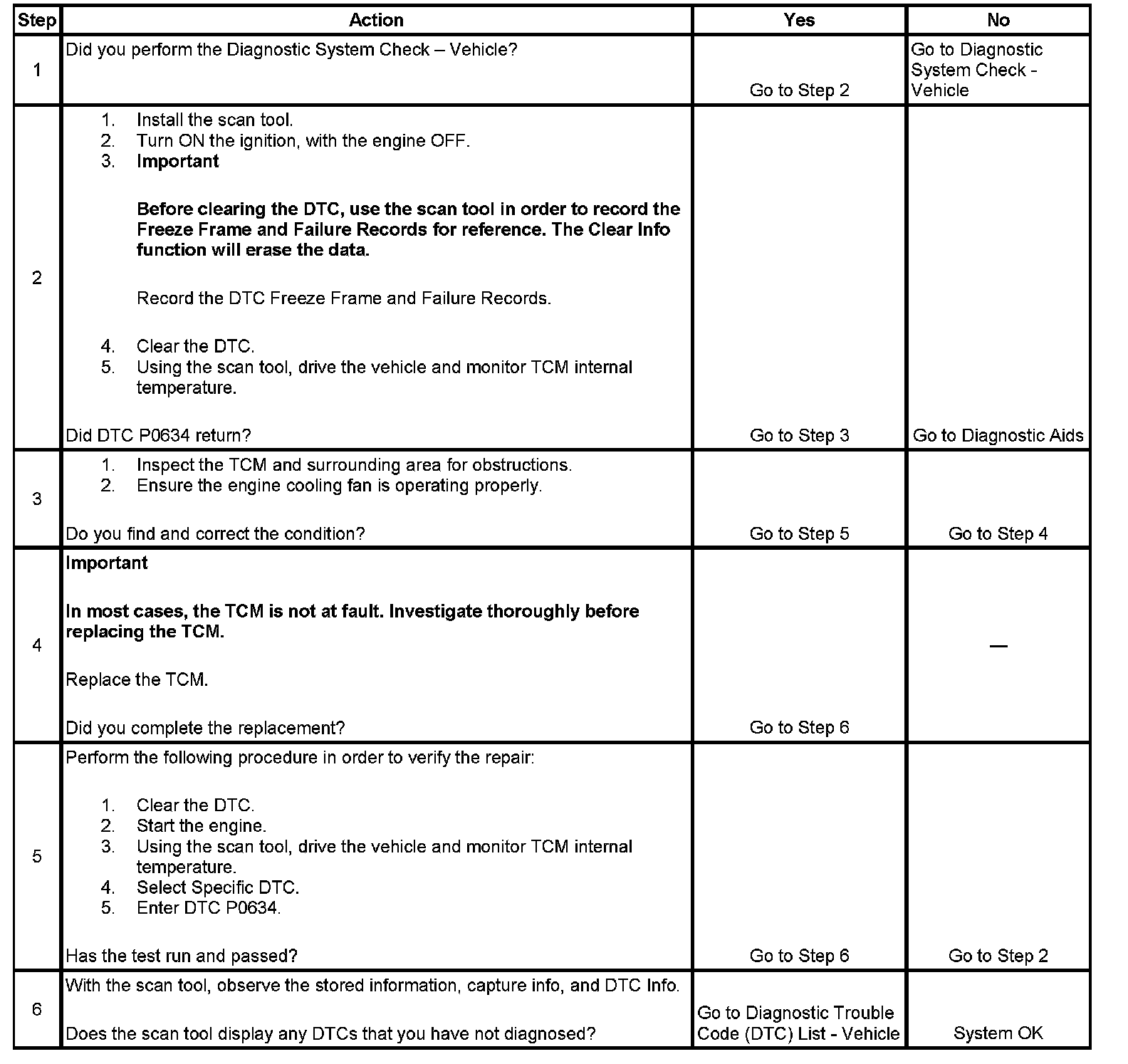 DTC P0634 sets if the TCM internal temperature is greater than or equal to 140°C (284°F) for 10 seconds with the engine running.